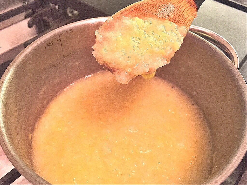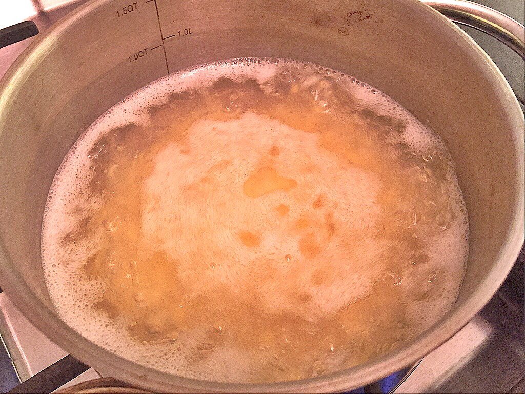 Bring 2 cups of water, mung bean, and sweet rice to a boil (on high) and then turn down the heat to a simmer until the rice falls apart and becomes like porridge. Stir occasionally. This process should take approximately 20 minutes.