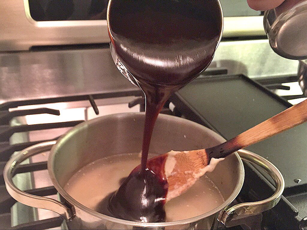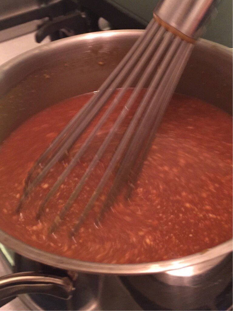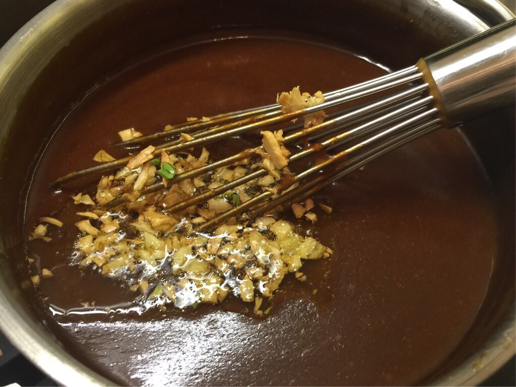 Transfer the sauce back to the pot and put on low heat. Add the hoisin sauce and 2 tbs of sriracha.