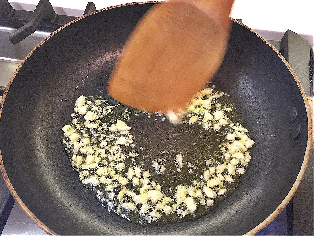 At the end, add some garlic oil and mix into the mixture for a more fragrant flavor. In a small pan, heat up extra virgin olive oil and minced garlic until the garlic is brown. Discard the garlic.