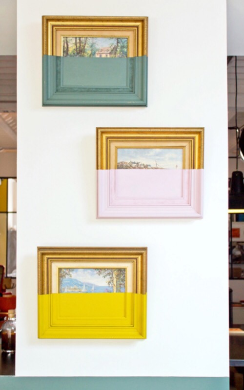 One interesting, fun idea was to get this “grandma” style gold leaf frames with landscape art but have half of them painted in a solid color (including the frame). Check first to be sure it is not a valuable piece!