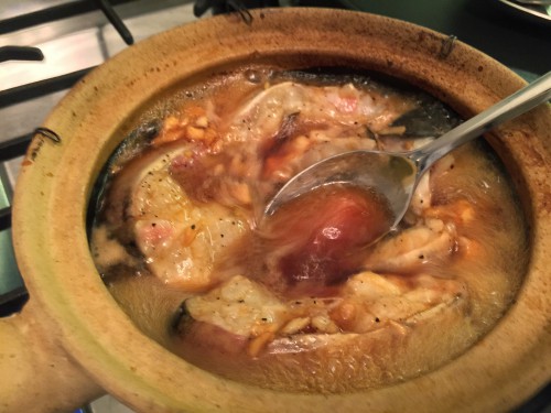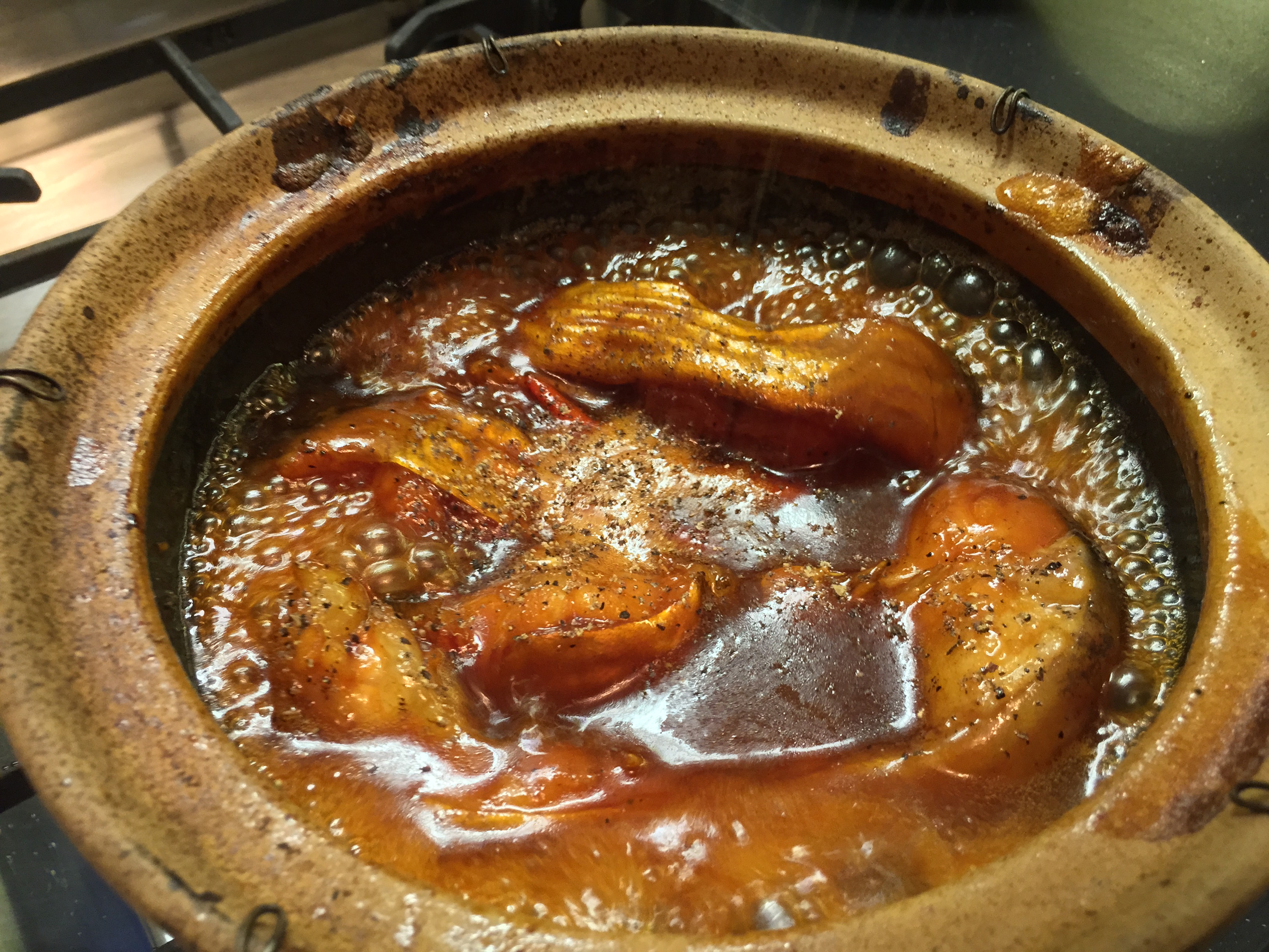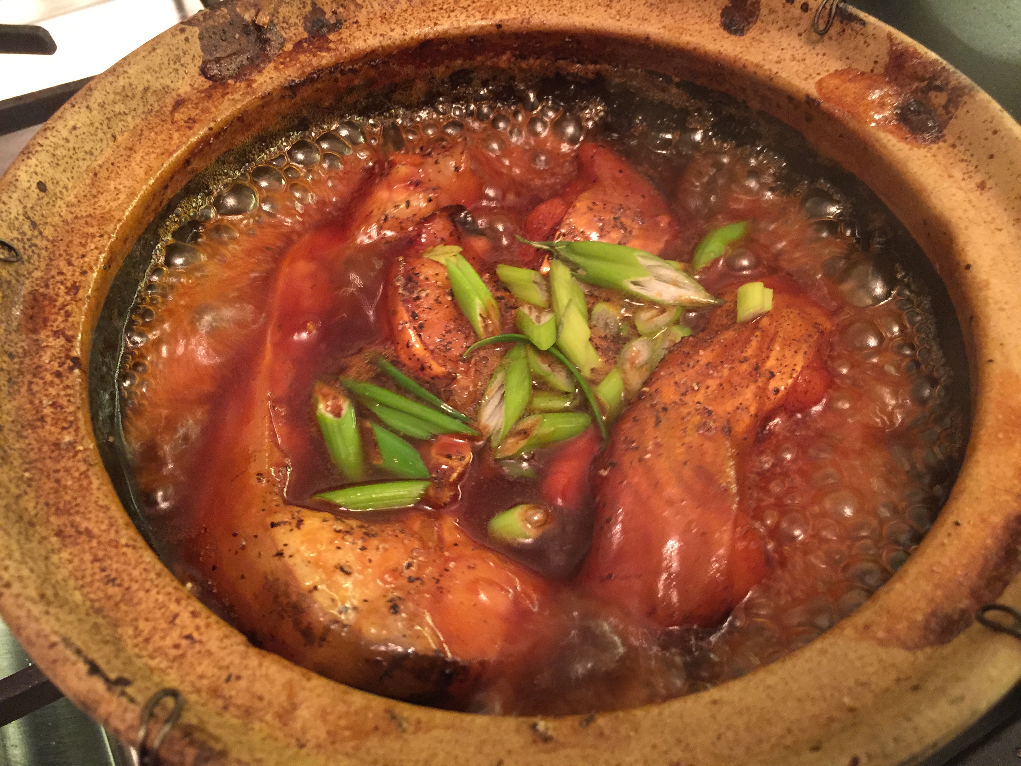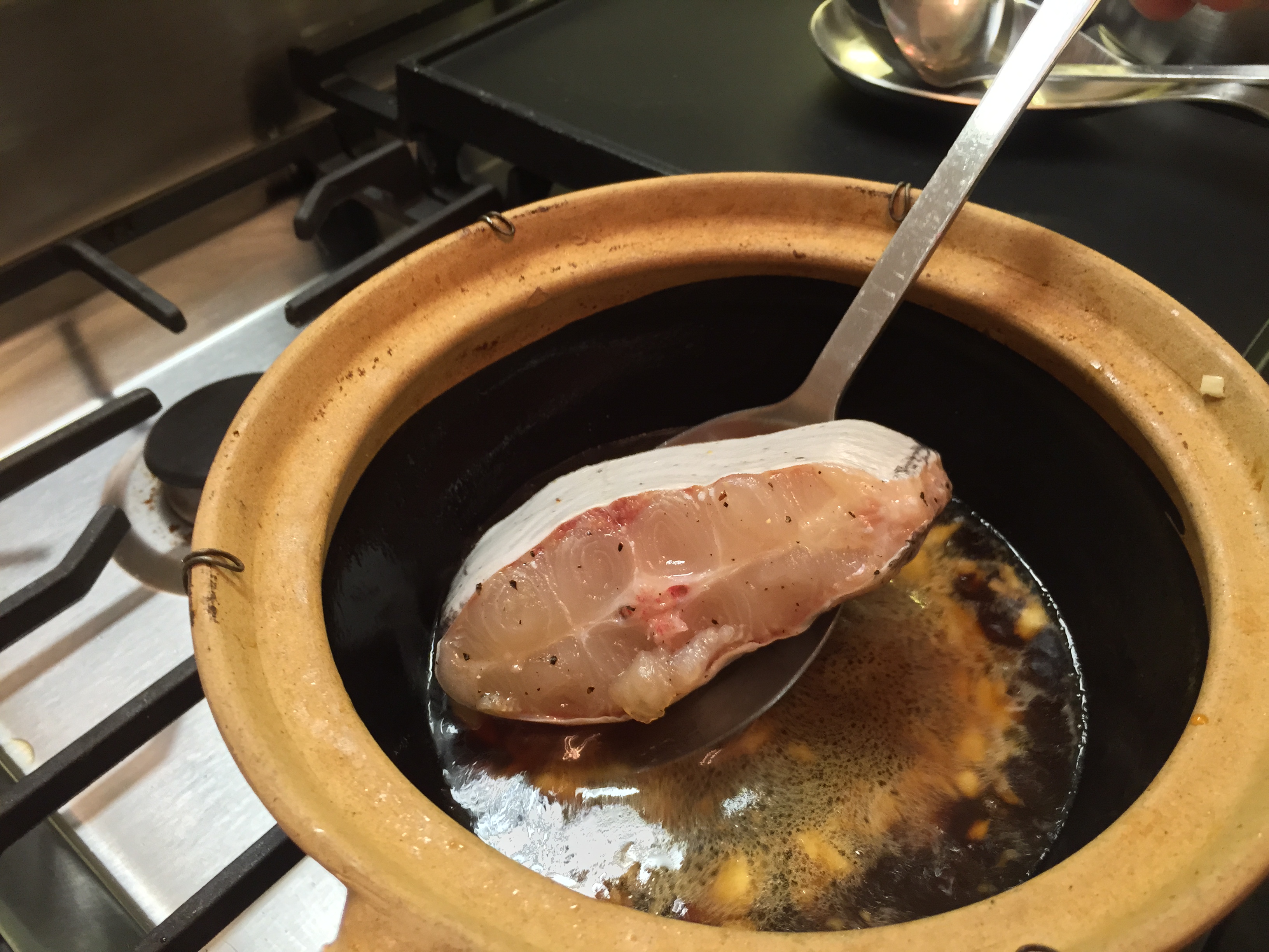The braising process should take about 20 minutes from the time the fish goes into the pot. You can see the changes in the color and liquid consistency in the following pictures.