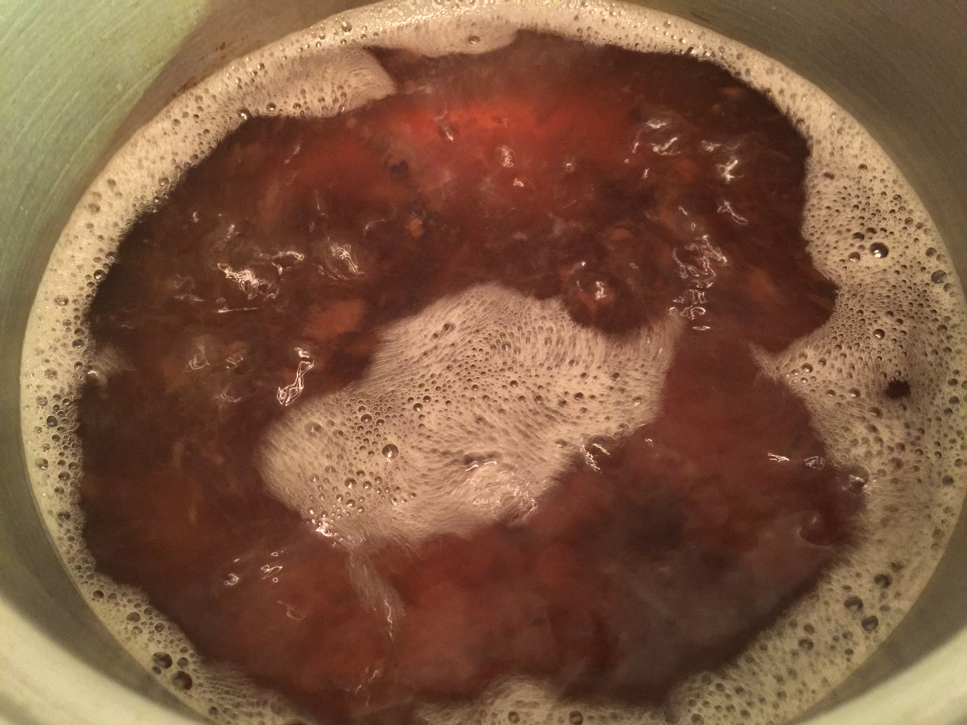 Once the tamarind has dissolved (about 15 minutes of boiling), use a slotted spoon or a mesh spoon to strain all the leftover tamarind into a bowl. Discard this.