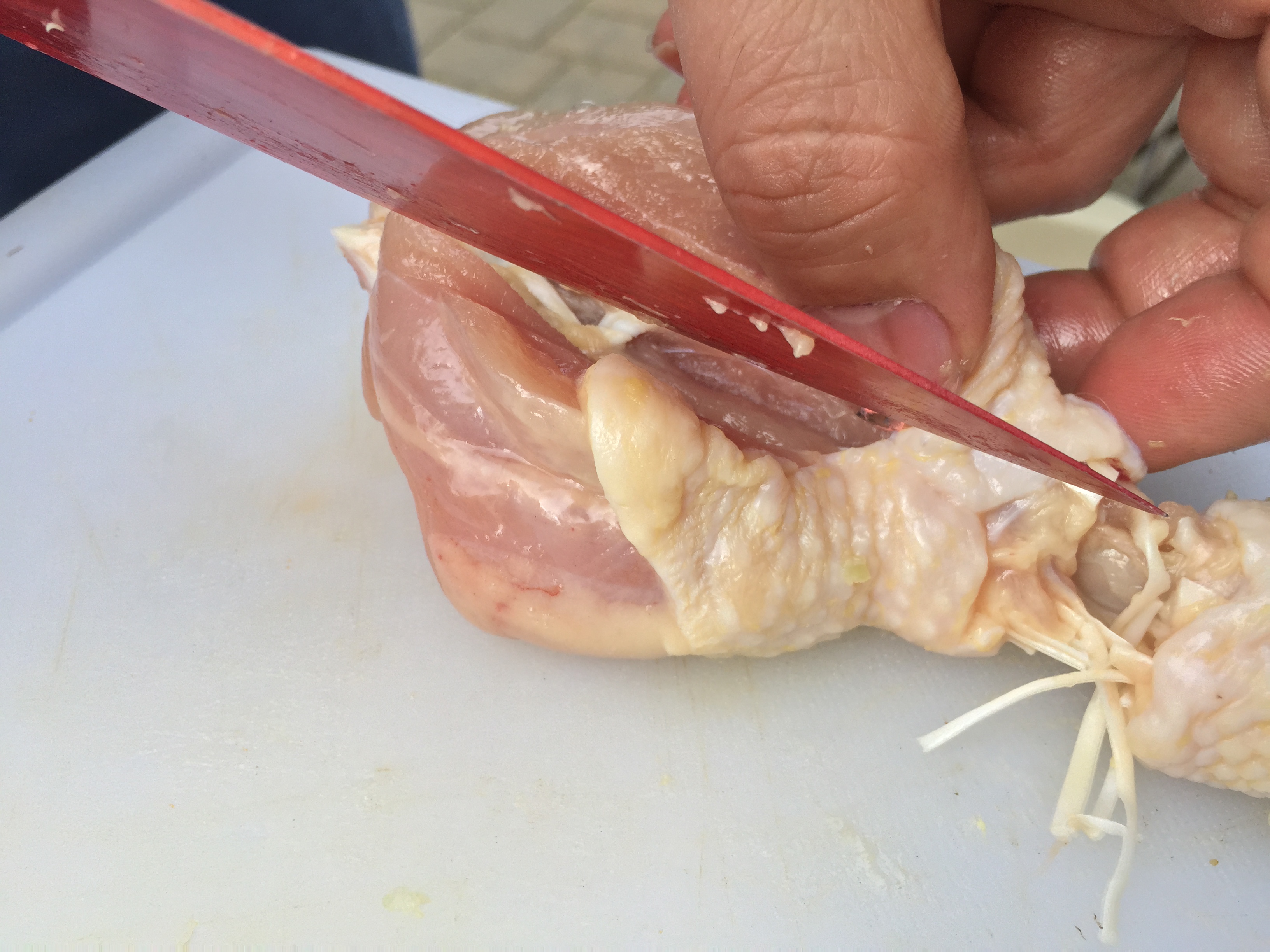 Prepare your meat of choice. For our demonstration, we used 2 ½ pound of bone in chicken thighs with skin on. The trick is to cut your chicken pieces in the same size, roughly slightly larger than a large clove of garlic.