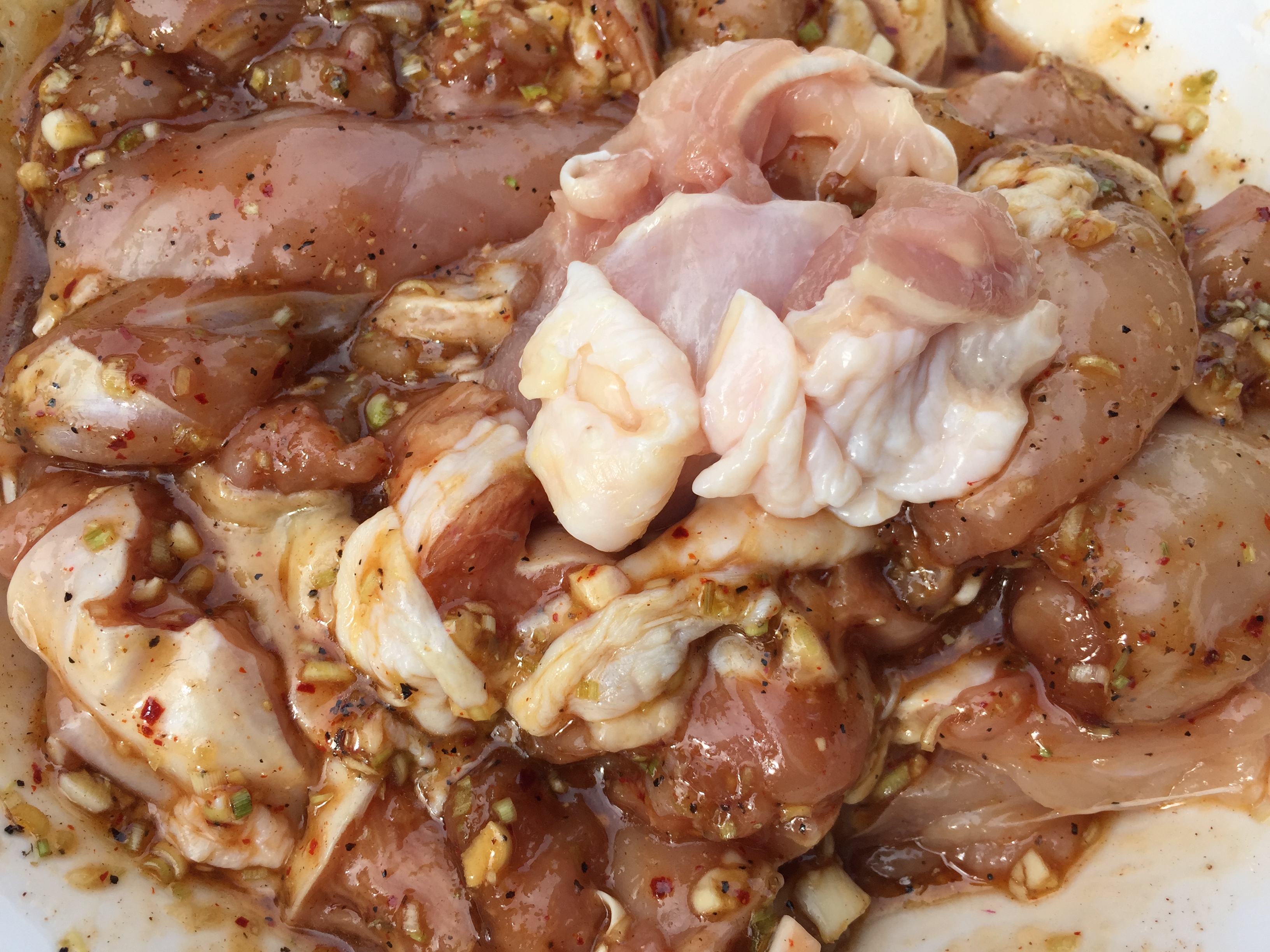 2 ½ pound to 3 pound of boneless chicken thighs with skin on. We did not have the boneless option so we deboned the meat ourselves.