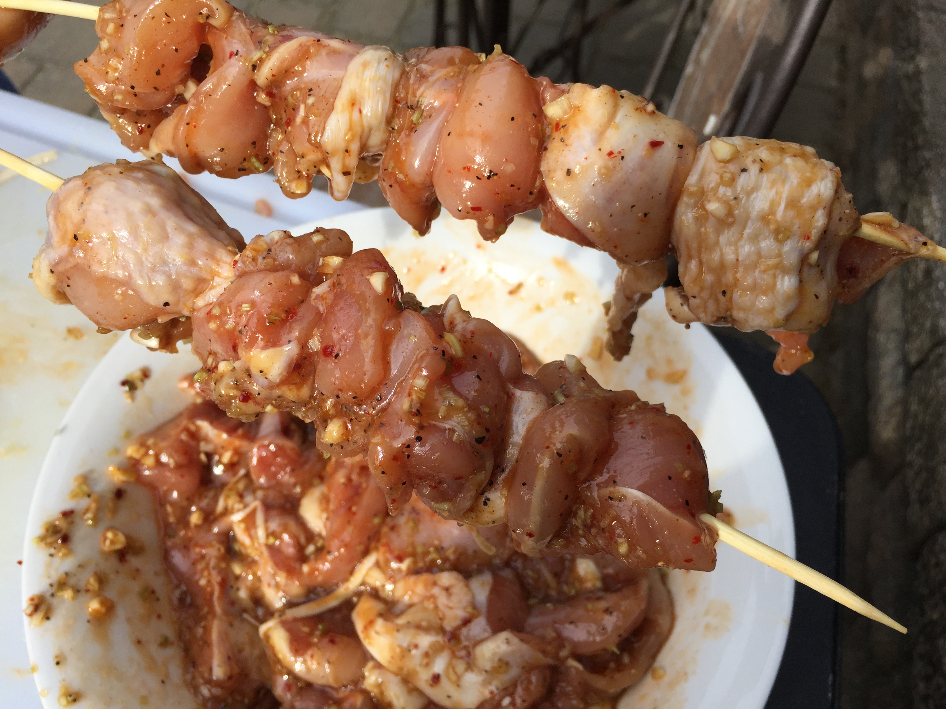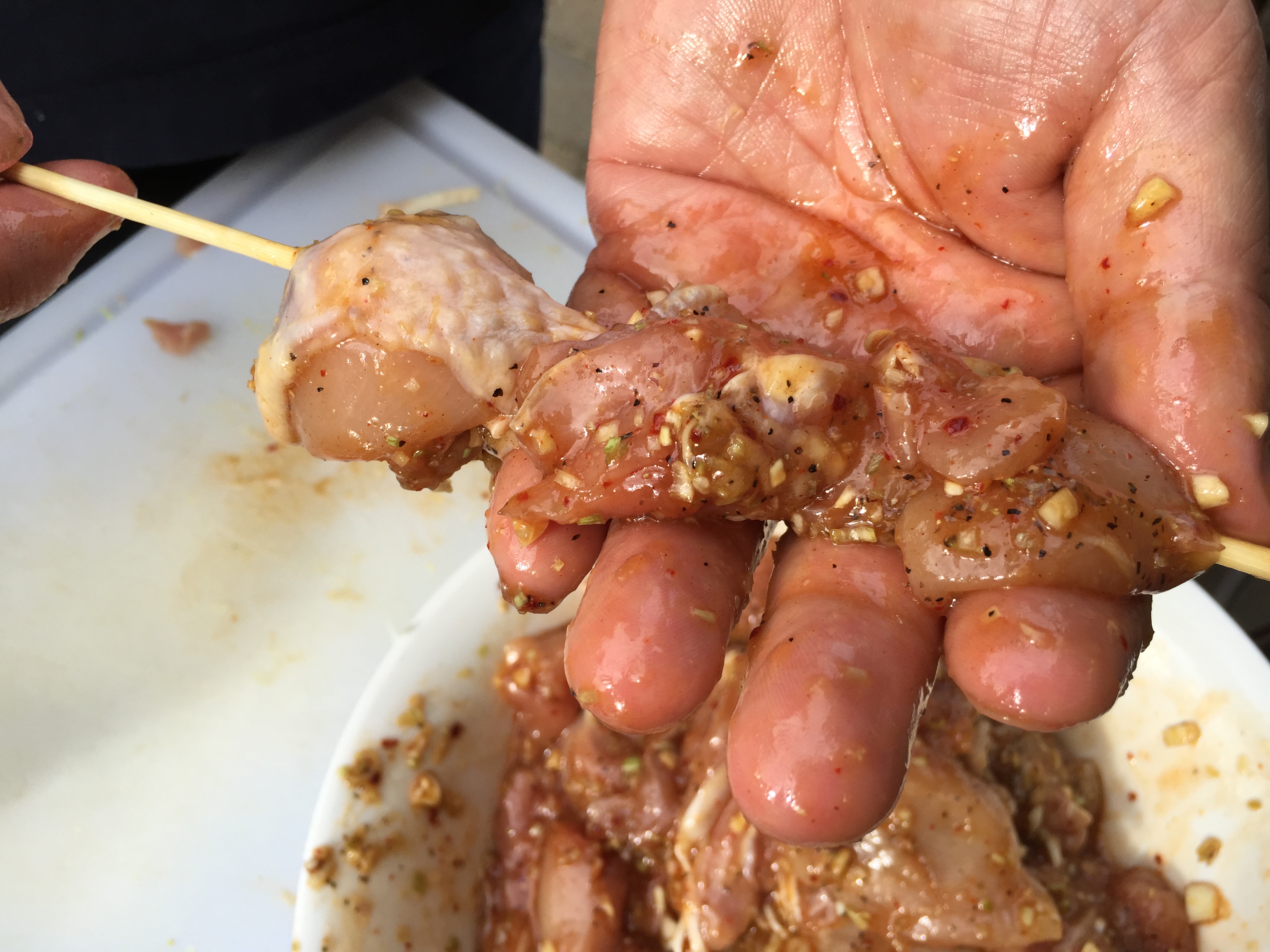 Put the chicken through the skewers ⅔ of the way. If there is skin on your meat, put the skin on the outside so it will get crispy. Otherwise, you will get a glob of fat with your meat if the skin is on the inside.