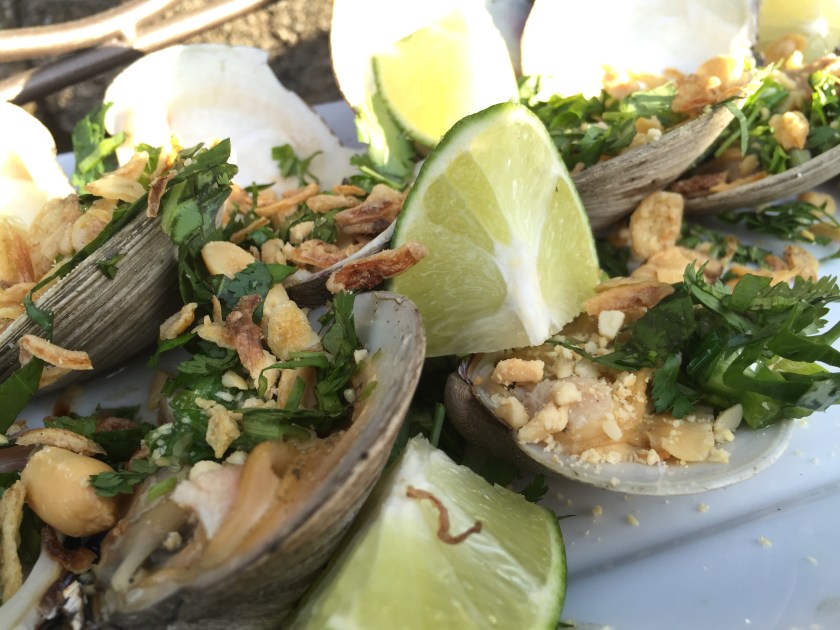 Put a small cube of butter onto the shellfish, follow up with your scallion oil, fresh herbs (culantro, cilantro and Thai basil), salted peanuts and fried shallots.