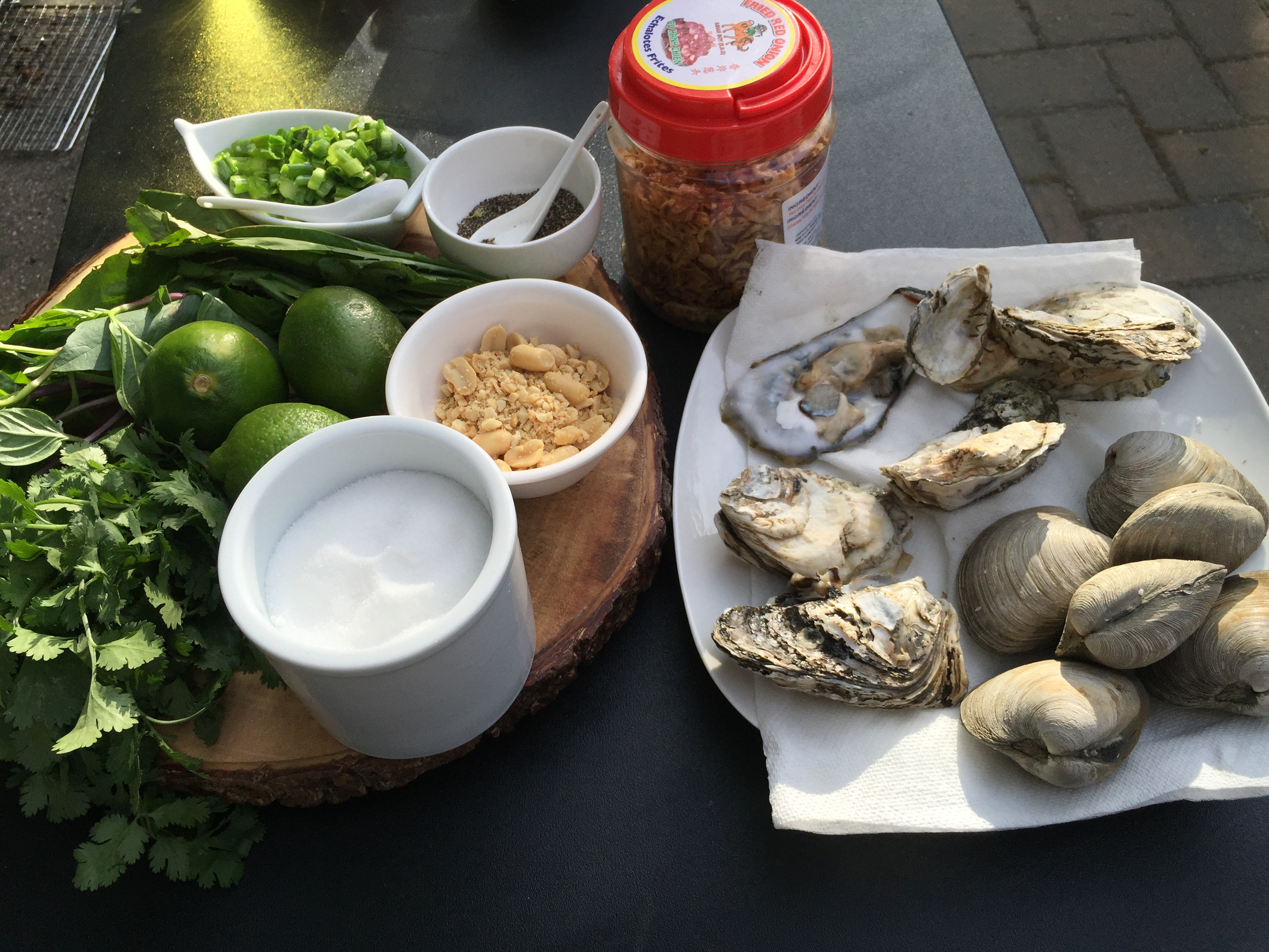 Put a small cube of butter onto the shellfish, follow up with your scallion oil, fresh herbs (culantro, cilantro and Thai basil), salted peanuts and fried shallots.