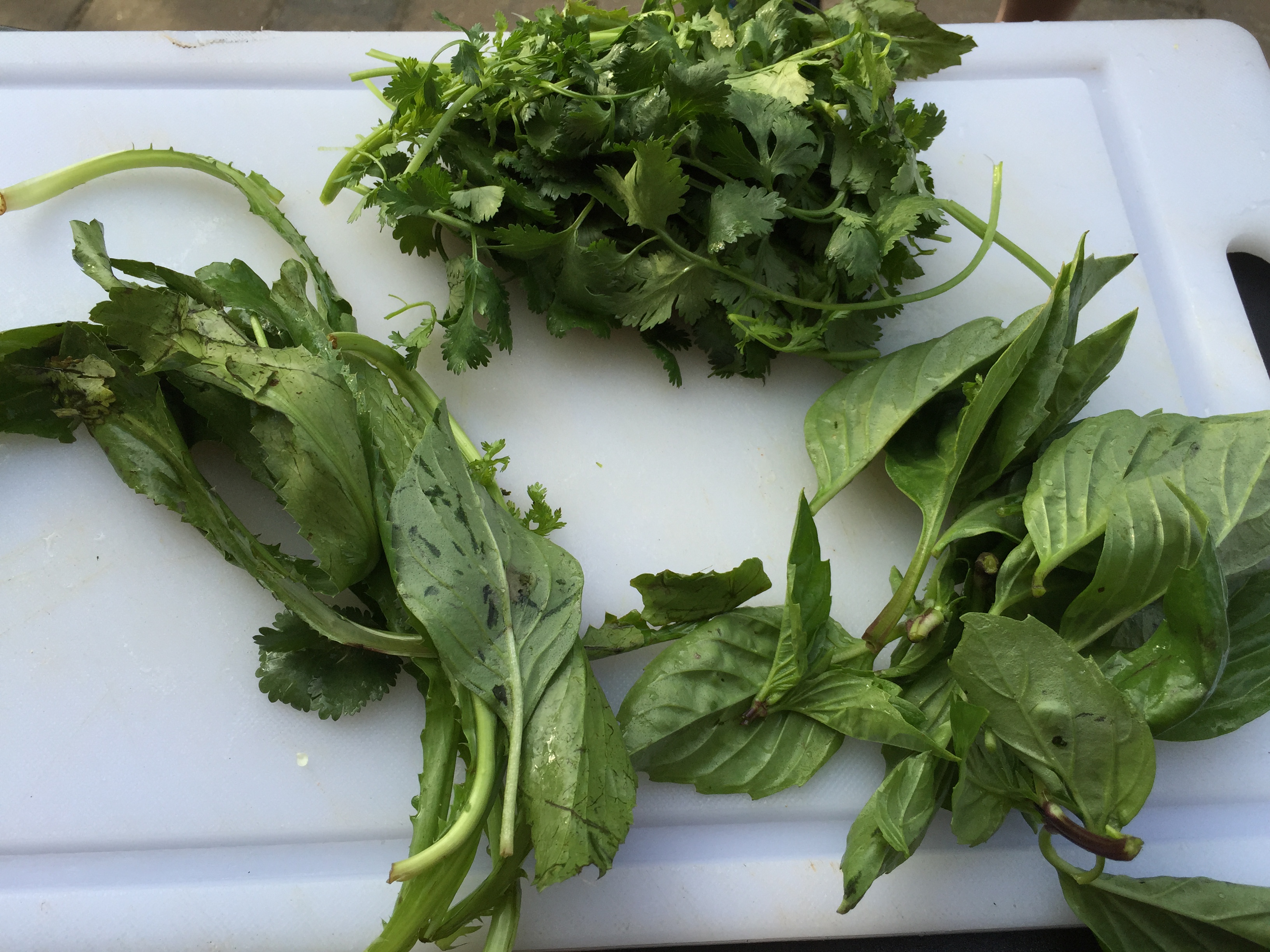 Combine the culantro, cilantro and Asian basil into a bunch and lightly chop them to make it easier to top the shellfish.