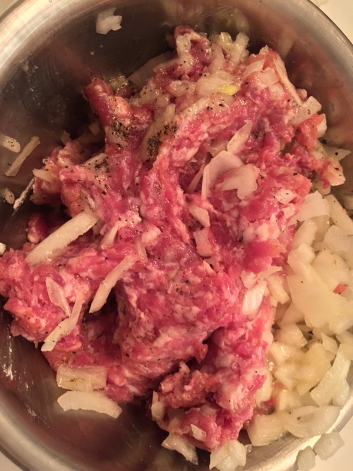 In a large bowl, add the pork, butter, sugar, salt, fish sauce, black pepper, baking powder, garlic and onion. Incorporate the ingredients together using your hands. This ensures the ingredients are incorporated thoroughly without over mixing the filling.