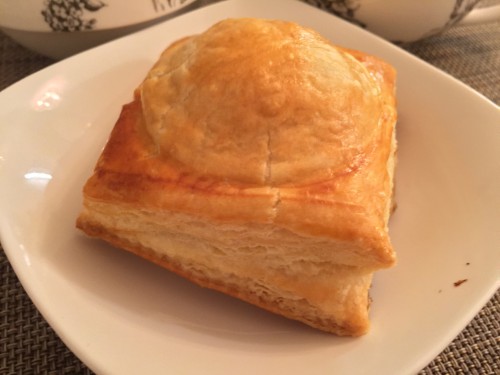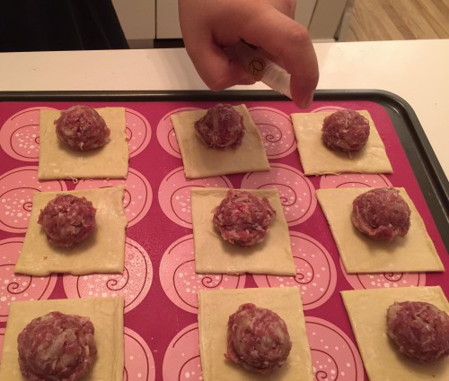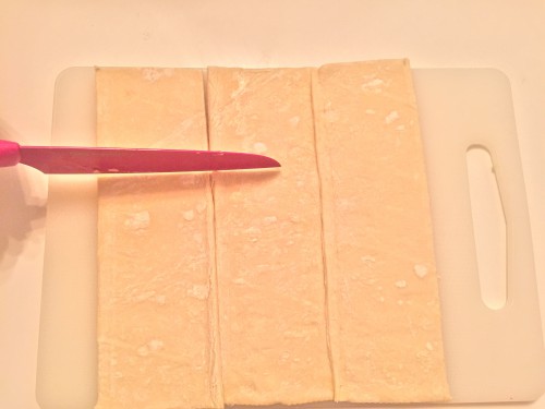 Lay out the frozen pastry sheets and cut into 9 even squares (3 x 3). Traditionally, pate chaud is round. Since we are making with pre-made pastry dough, it’s best not to waste any of the dough.