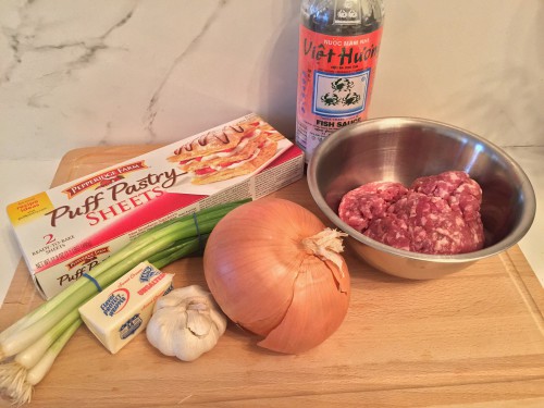 Another snack I really enjoyed as a child was bánh patê sô. Bánh patê sô is a Vietnamese savory puff pastry that is likely derived from the French colonization. Many of the Vietnamese cuisines have flavors and techniques from the French culinary tradition. How else would we have the ubiquitous bánh mì which is our version of a baguette sandwich? This pastry is made with traditional puff pastry or pâte feuilletée and filled with ground pork, bean thread noodles and mushrooms. The beauty of this pastry is that you can fill it with whatever you fancy. For this version, we allowed for the ground pork to shine in its simplicity. As summer is in full swing, this is a perfect treat to take with you on a picnic or a roadtrip.