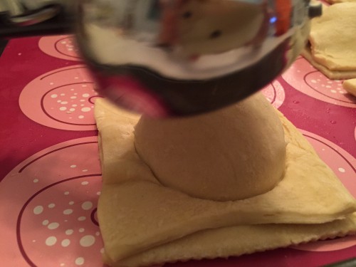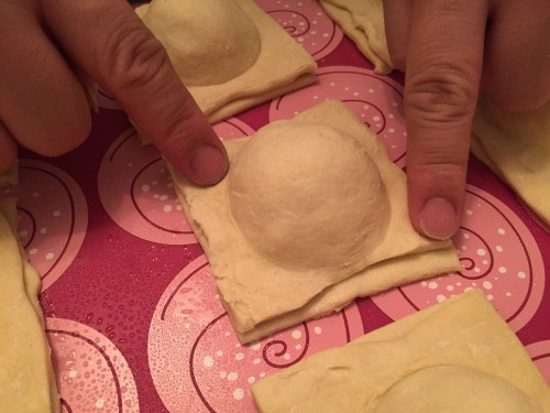 Use a big round spoon or an ice cream scoop to lightly indent the filling into the squares. The object is to form a shape so the filling will not spill out and not to cut through the dough.