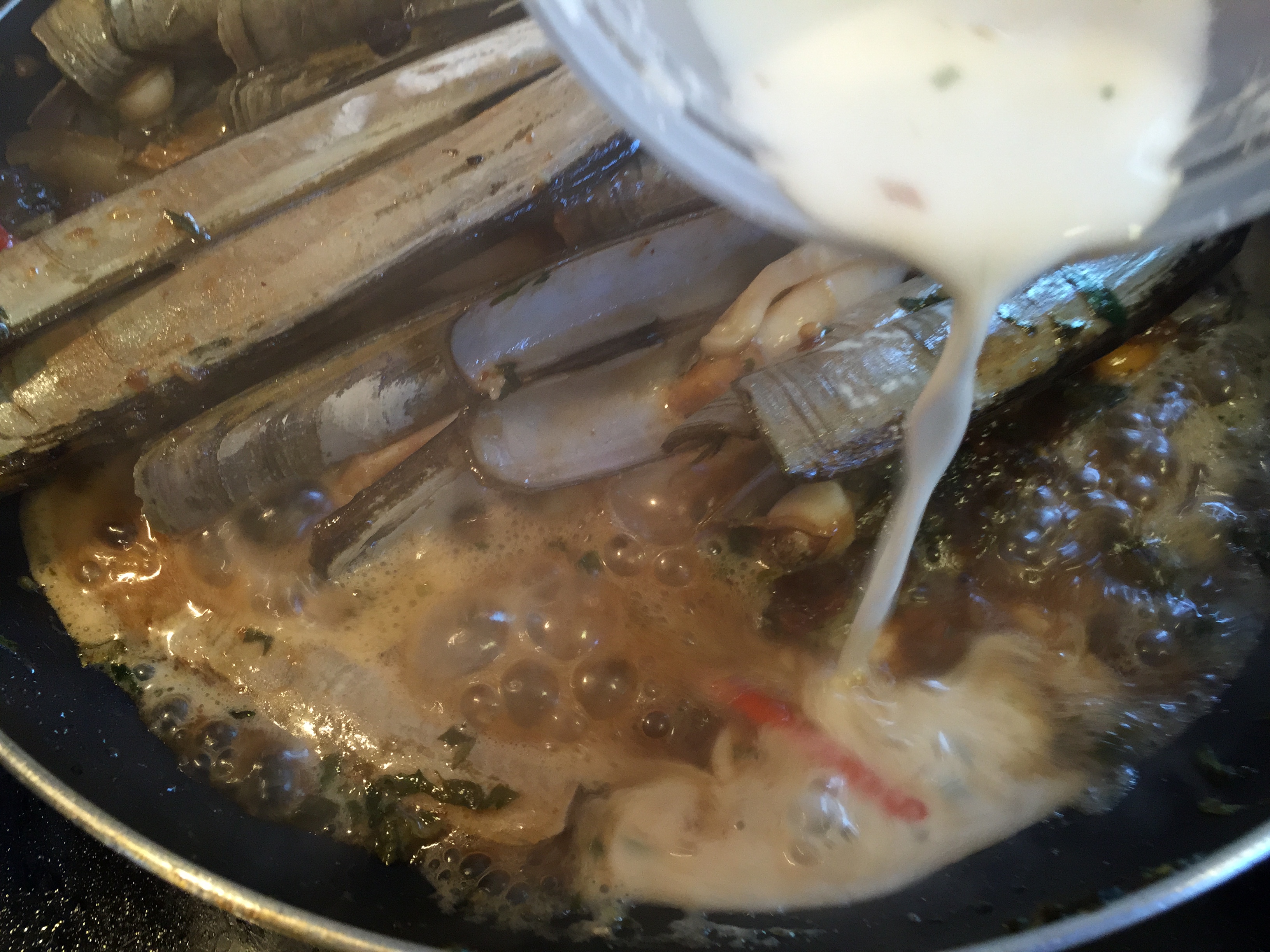 Lower the heat to medium and push the clams to the side of the pan. Slowly stir in the thickening starch agent.