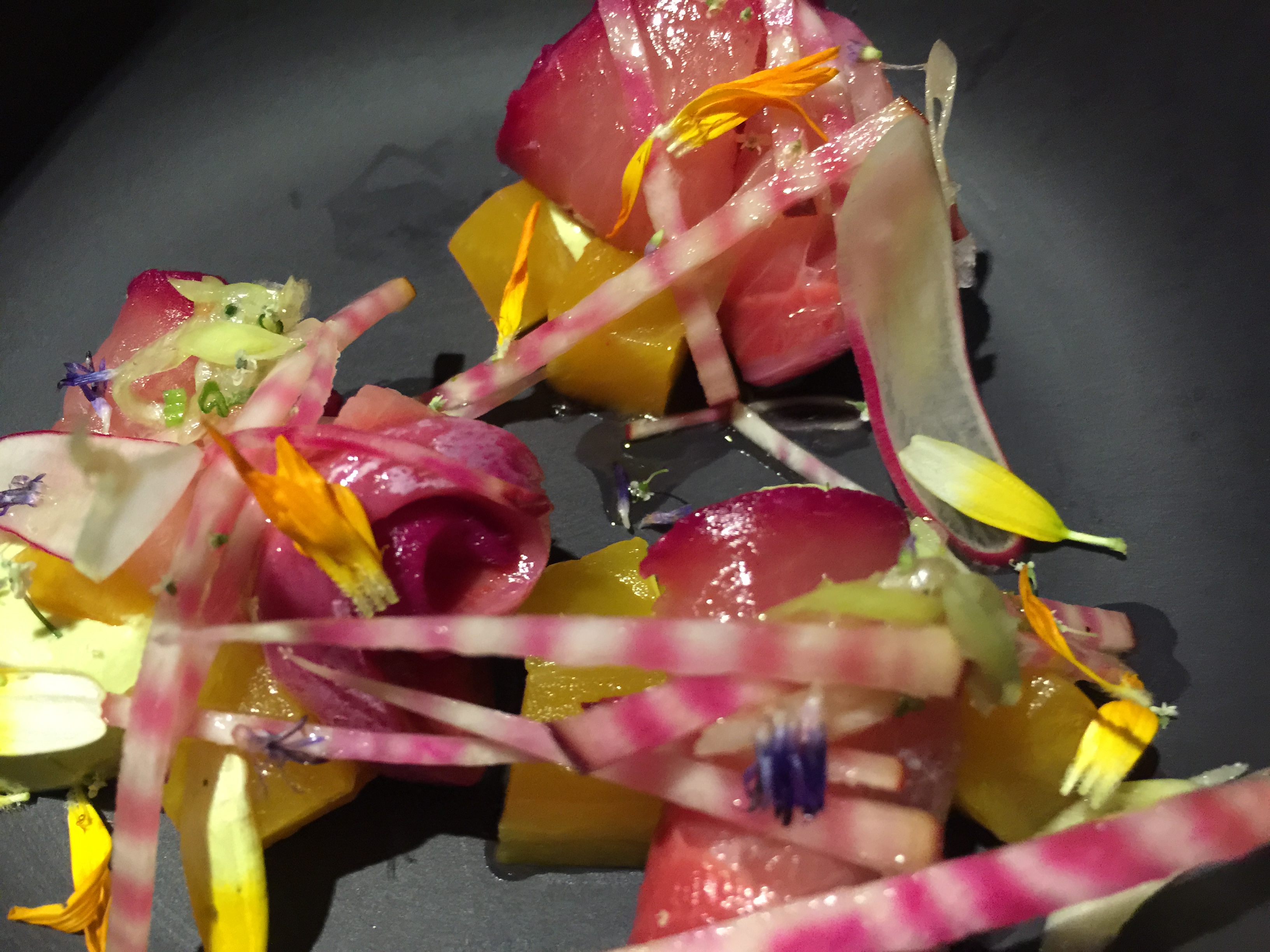 Dish 1: Hamachi Radish, Beets, Green Garlic $15