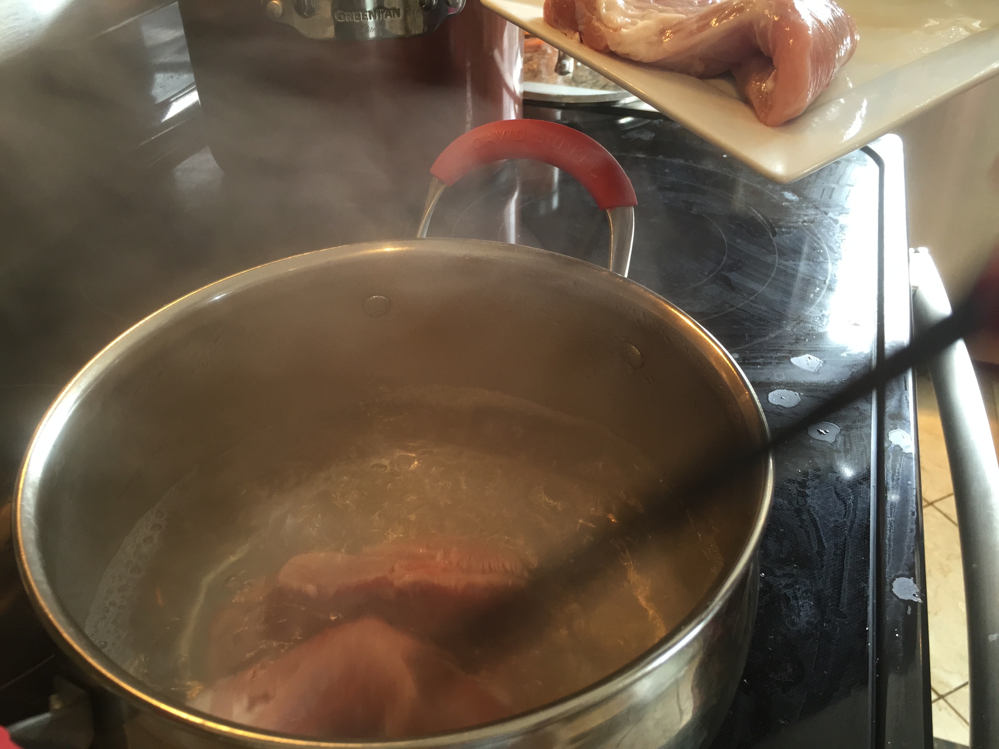 Once the water comes to a boil, add the pork shoulder and let it boil for 20-25 minutes.