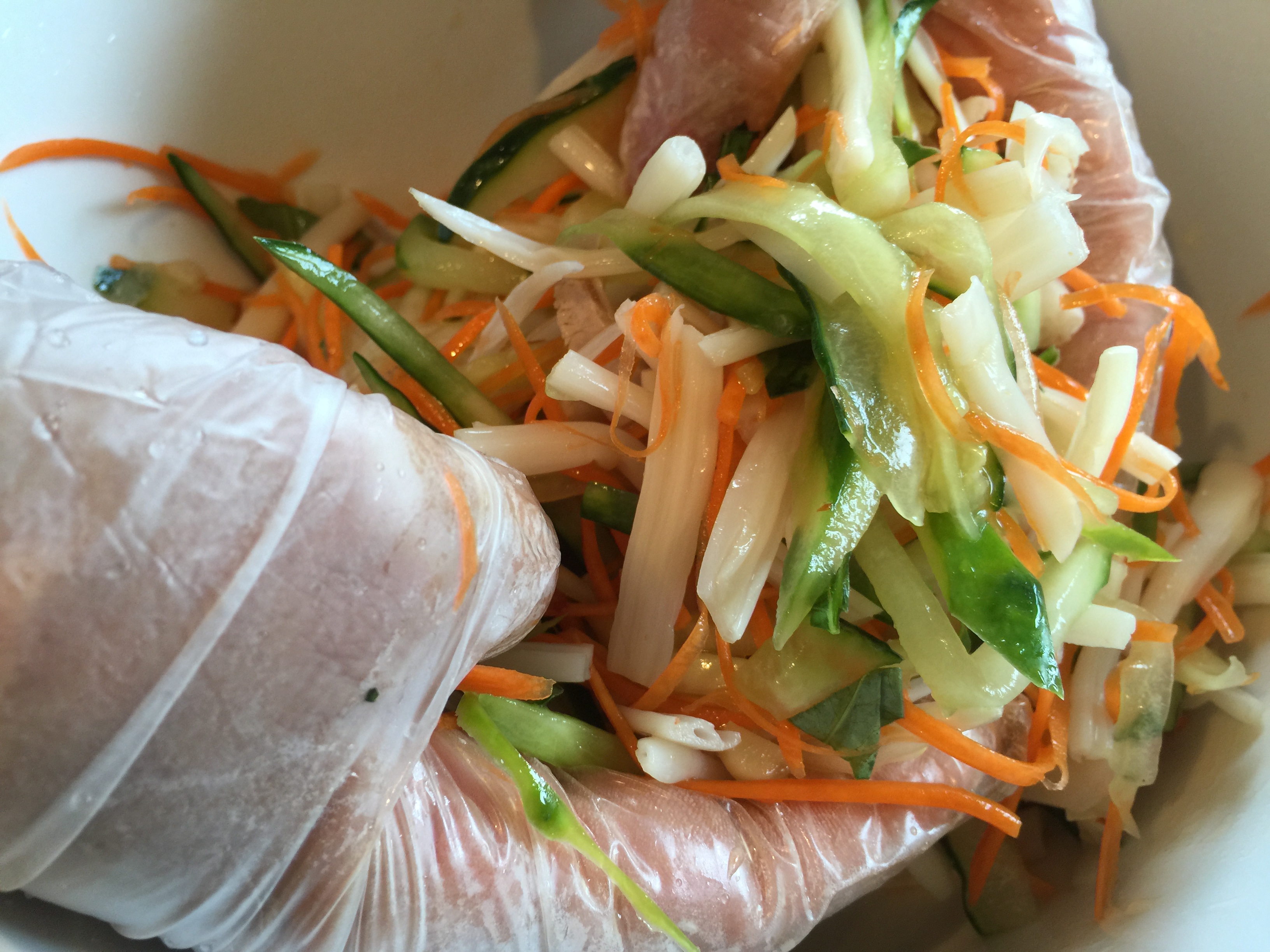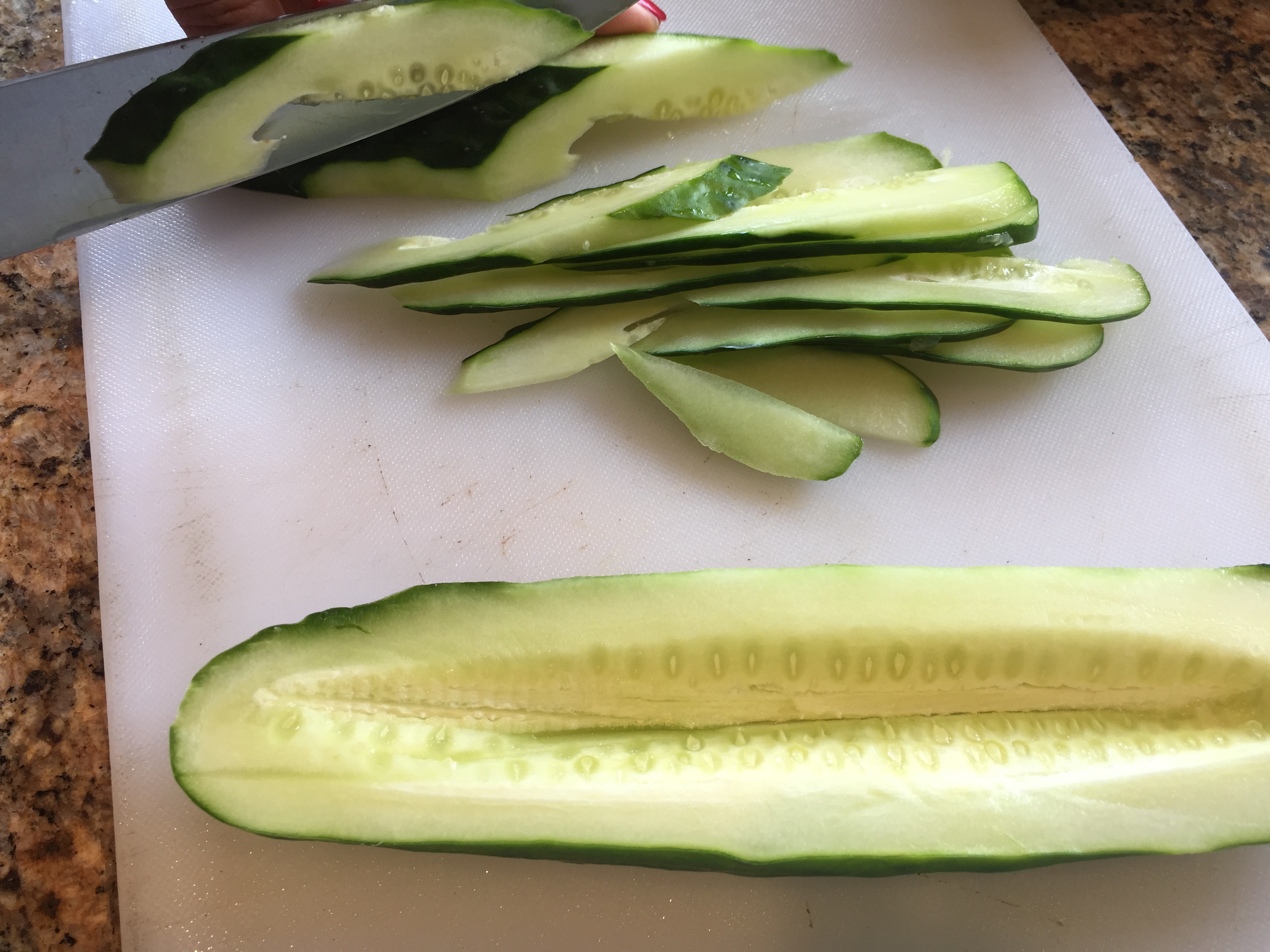 Hollow out the seeds of 1 large cucumber and thinly slice it on a diagonal, lengthwise. Julienne the slices so that it mirrors the shredded carrots. Soak the cucumber in a bowl of ice water with 1 teaspoon of salt and ½ teaspoon of sugar.