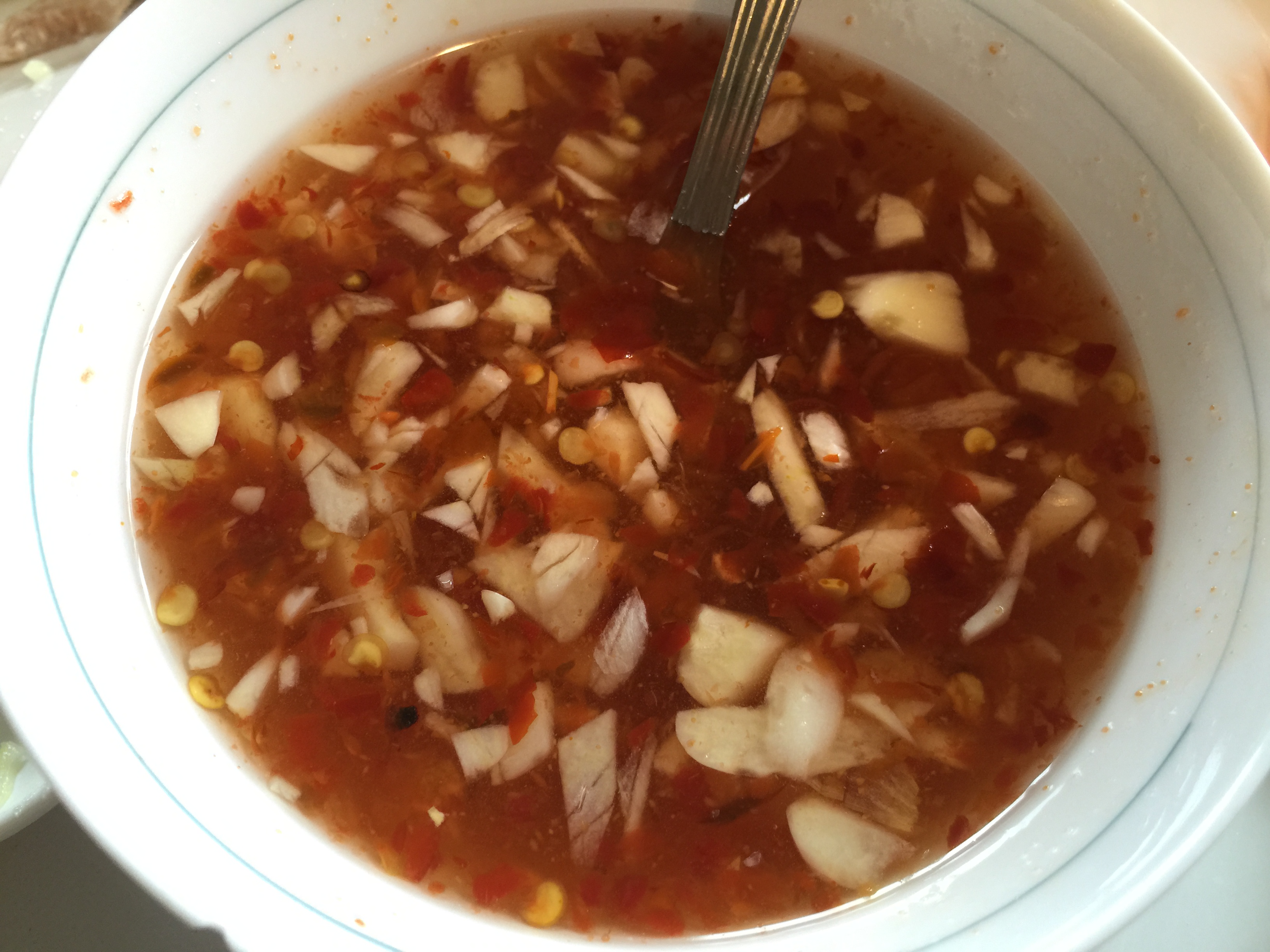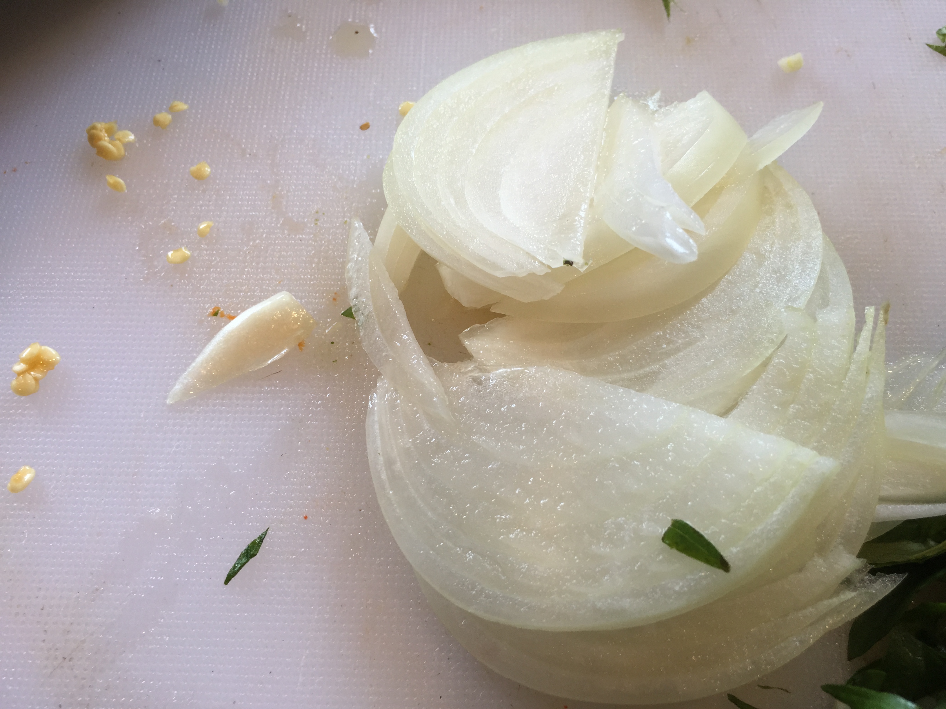 Thinly slice ¼ of a yellow onion and soak the slices in a bowl with 2 teaspoons of cold water, 1 teaspoon of vinegar, ½ teaspoon of salt and 1 teaspoon of sugar. Set aside. This will remove the bite and brings out the sweetness of the onion.