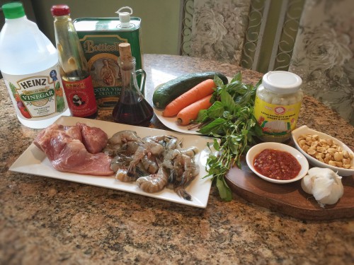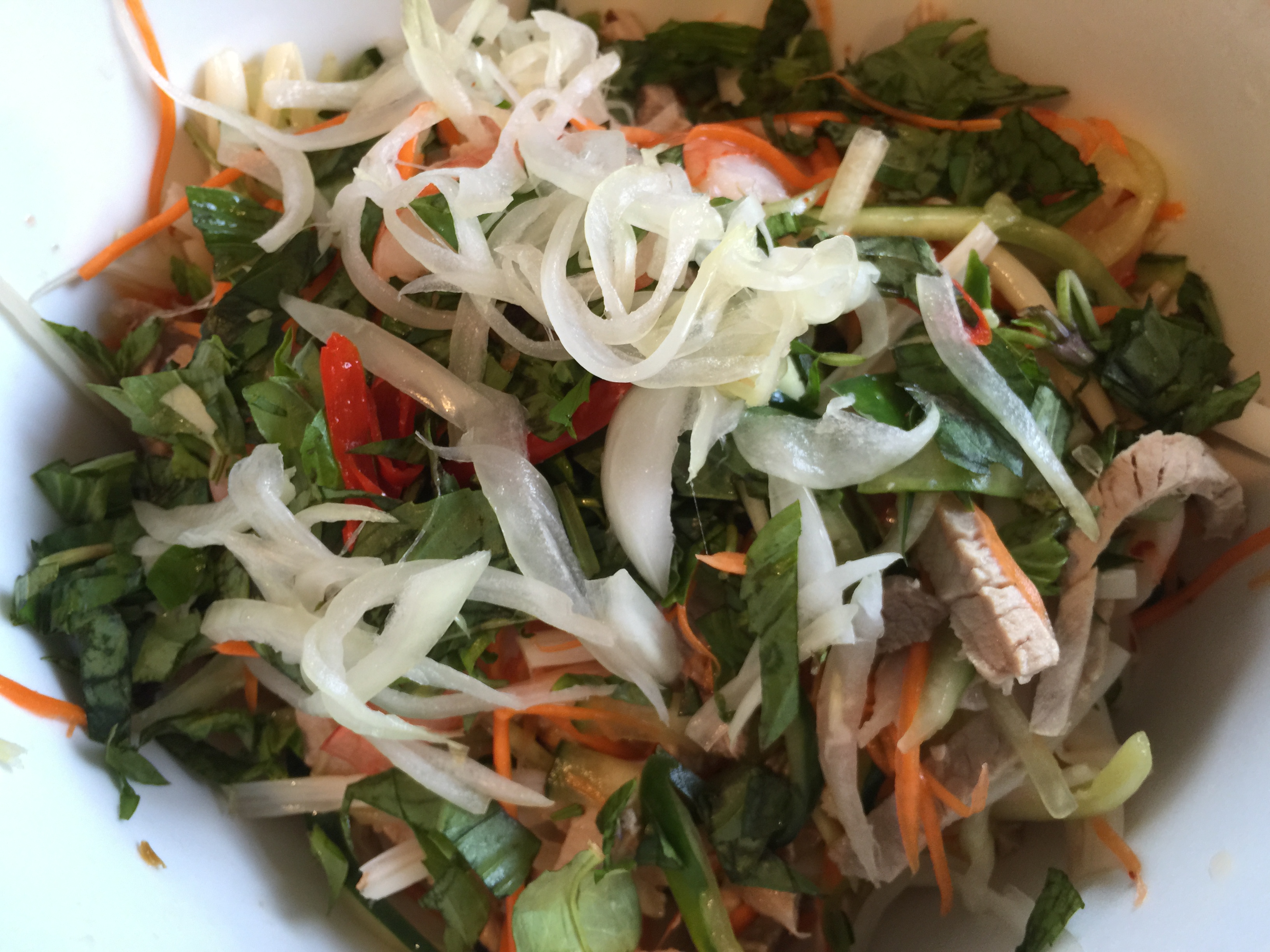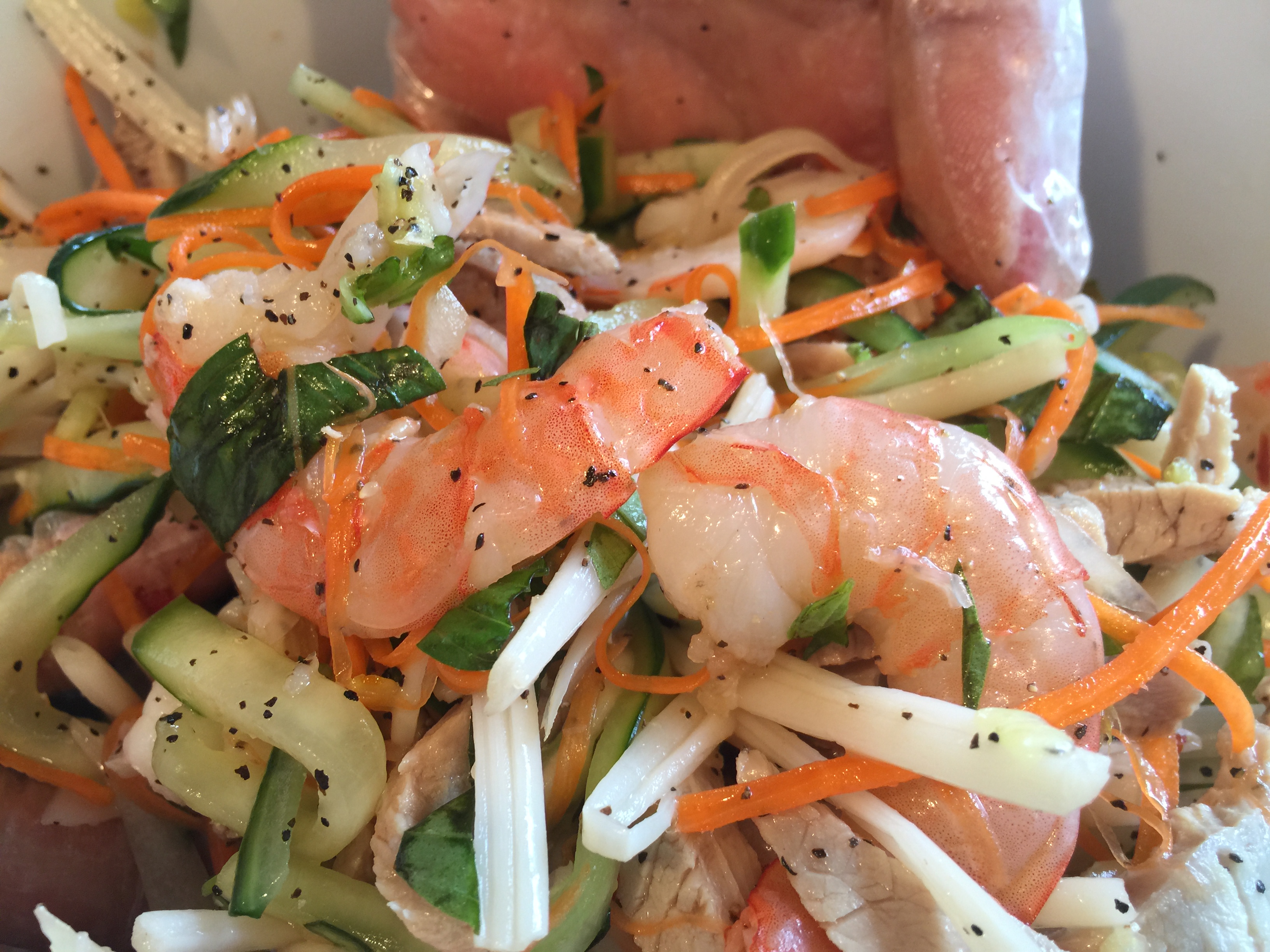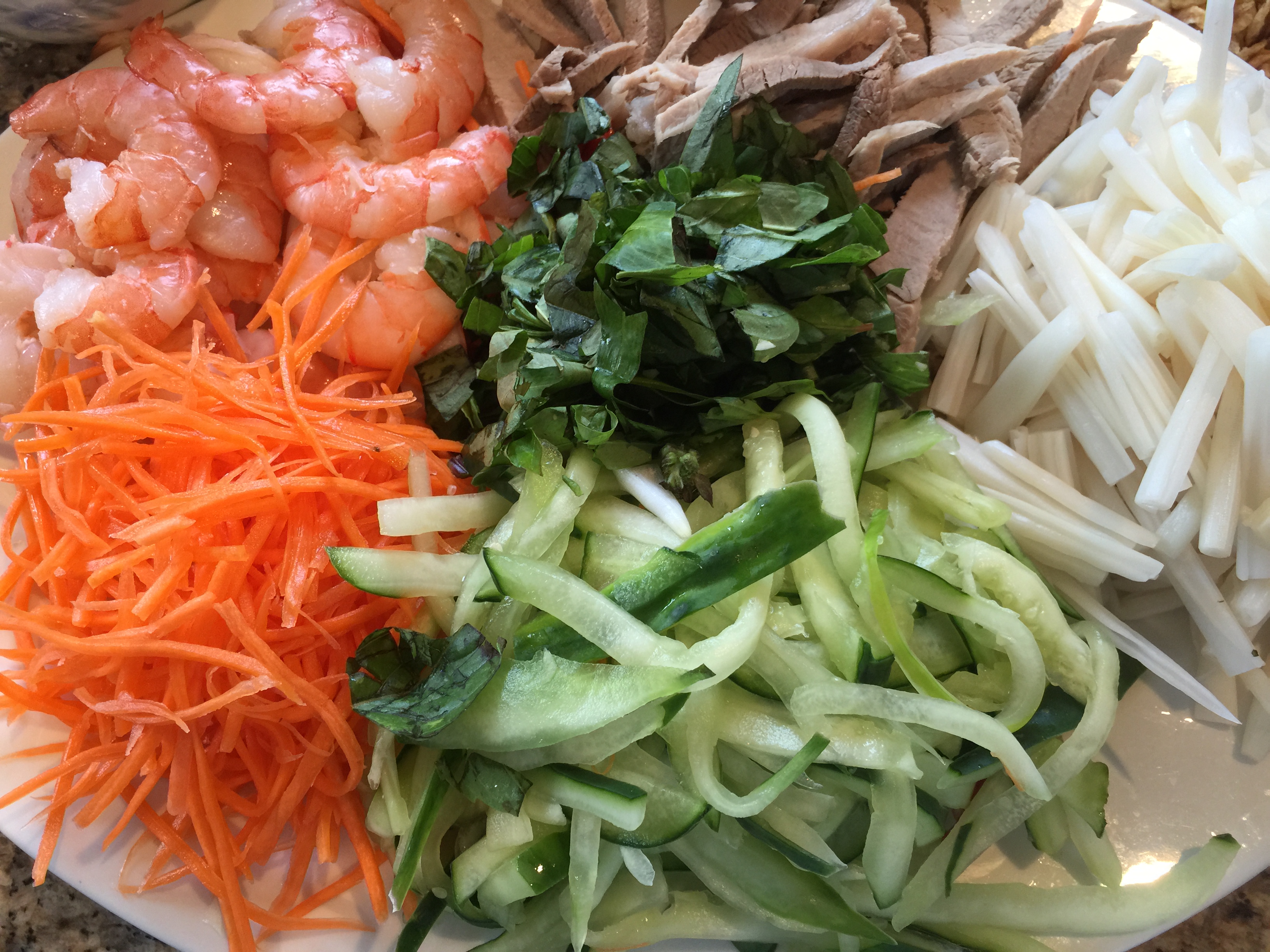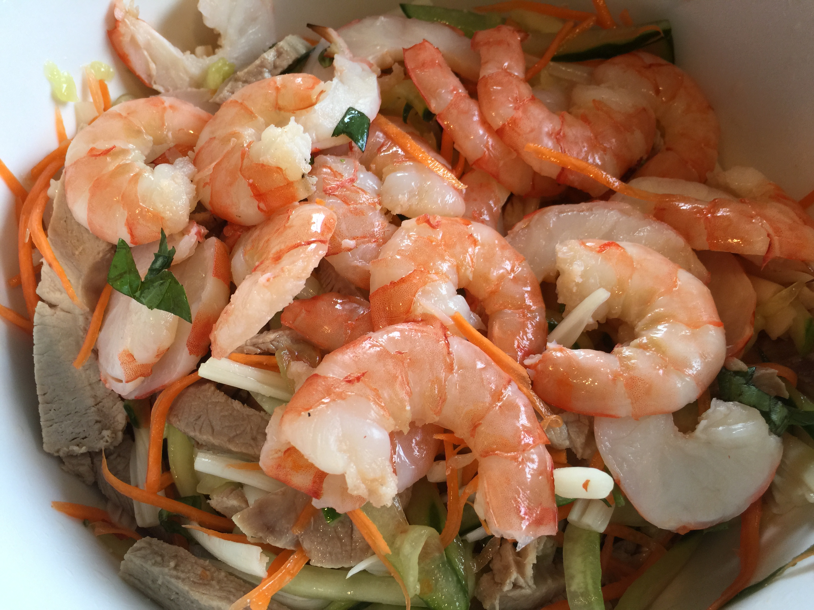 Gỏi tôm thịt or a traditional Vietnamese summer salad with boiled shrimp and pork is a staple at my family’s parties. Whenever there is a BBQ, you can guarantee some type of salad will be served and it is usually gỏi tôm thịt. It is not hard to see why this dish is popular in the summer. It is refreshing with numerous vegetables in a sweet and sour vinaigrette. My mom has many tricks to make this version even more flavorable. It is all about the preparation method and making sure you mix all the ingredients well without over mixing. I like to mix this gỏi by hand to ensure the vegetables are not bruised. This recipe serves about 4 people and is rated easy.