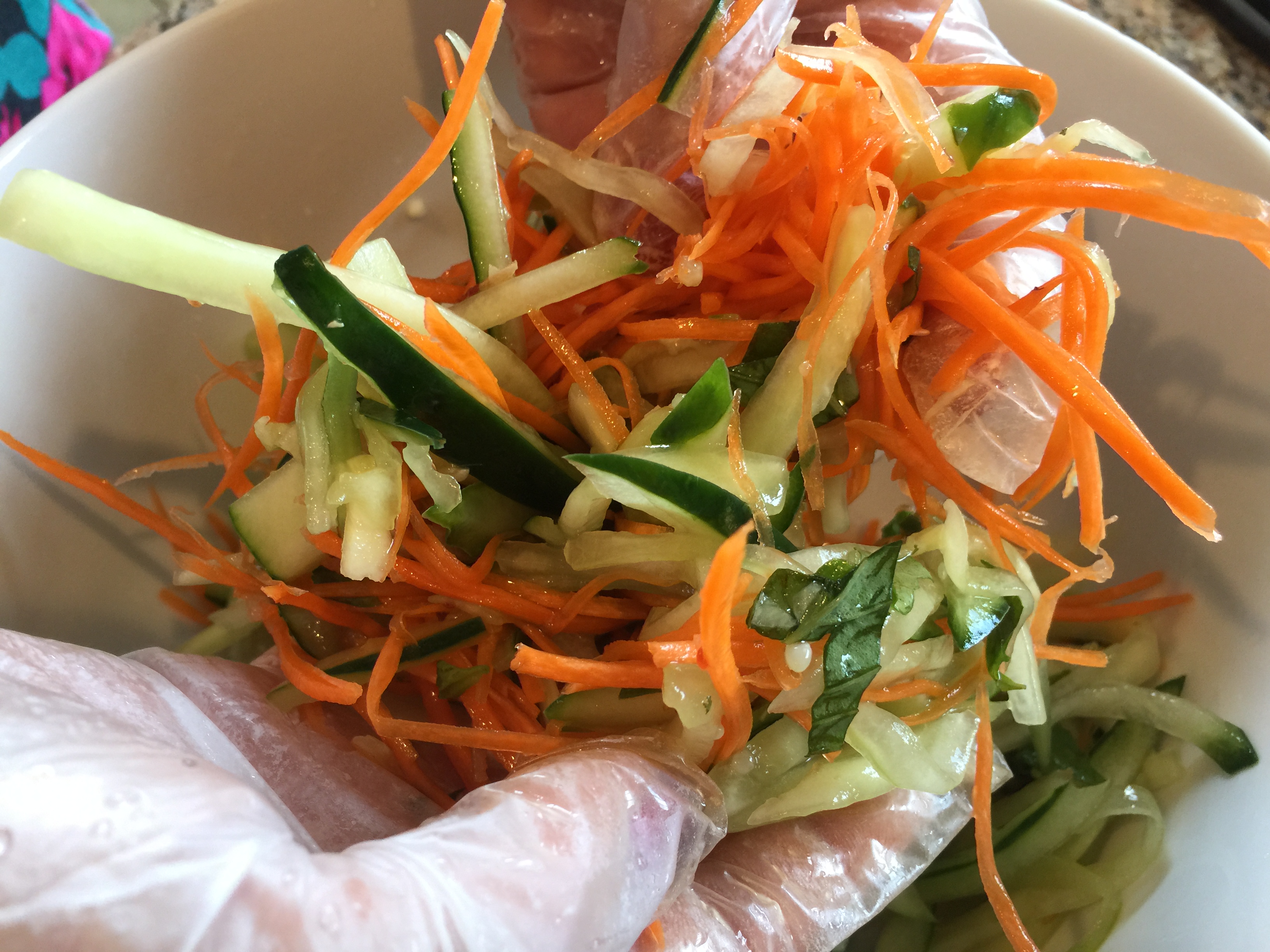 In a large bowl, add the cucumber and carrots with 3 tablespoons of the sauce. Mix to incorporate the ingredients. It is best to mix it with your hands so you do not bruise the vegetables.