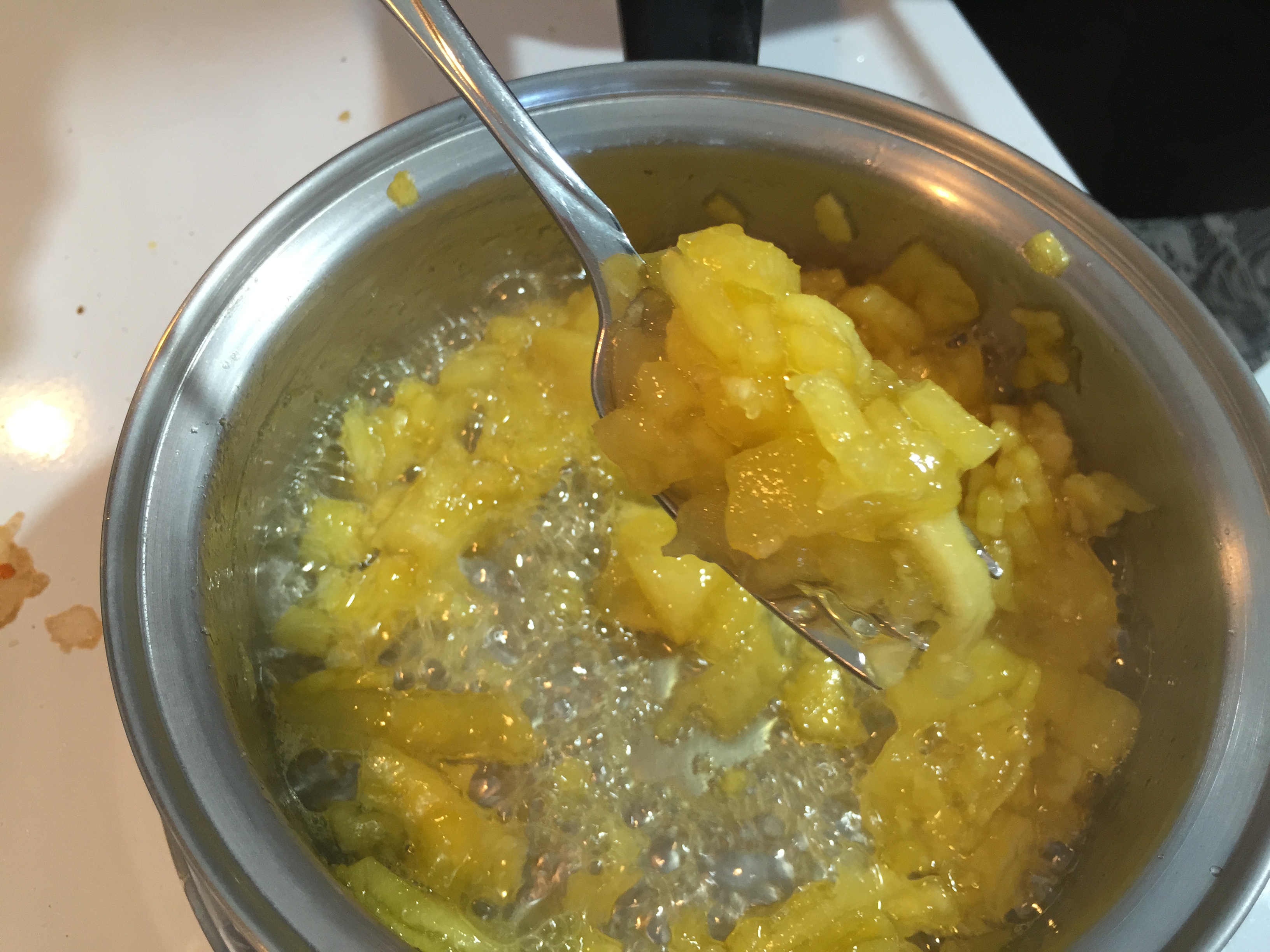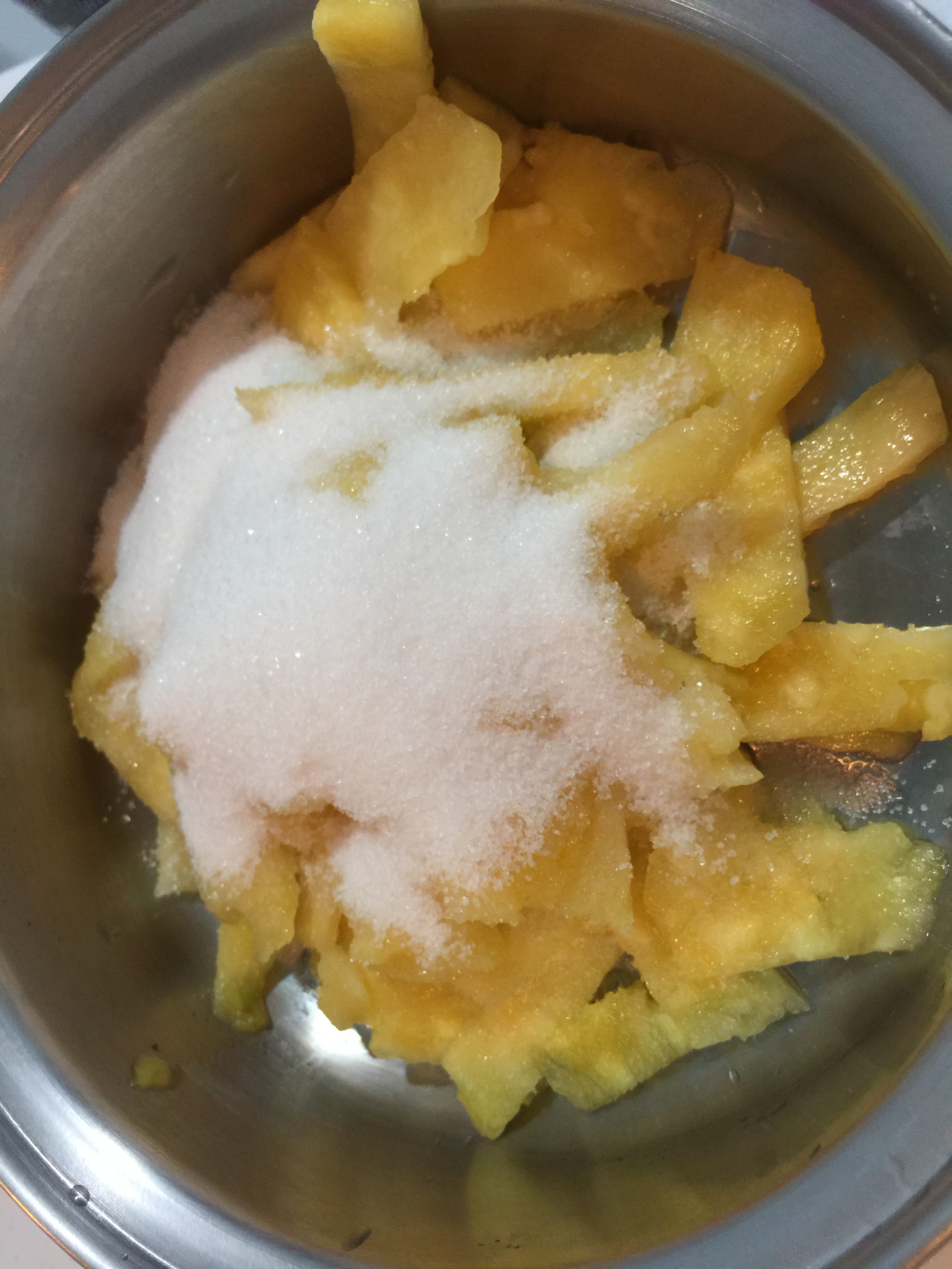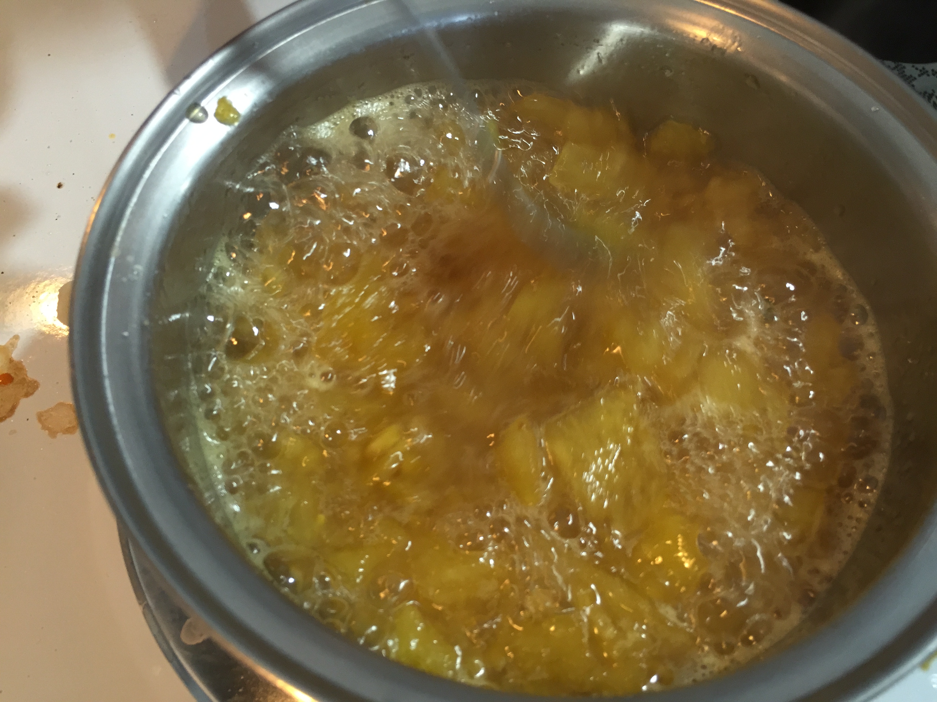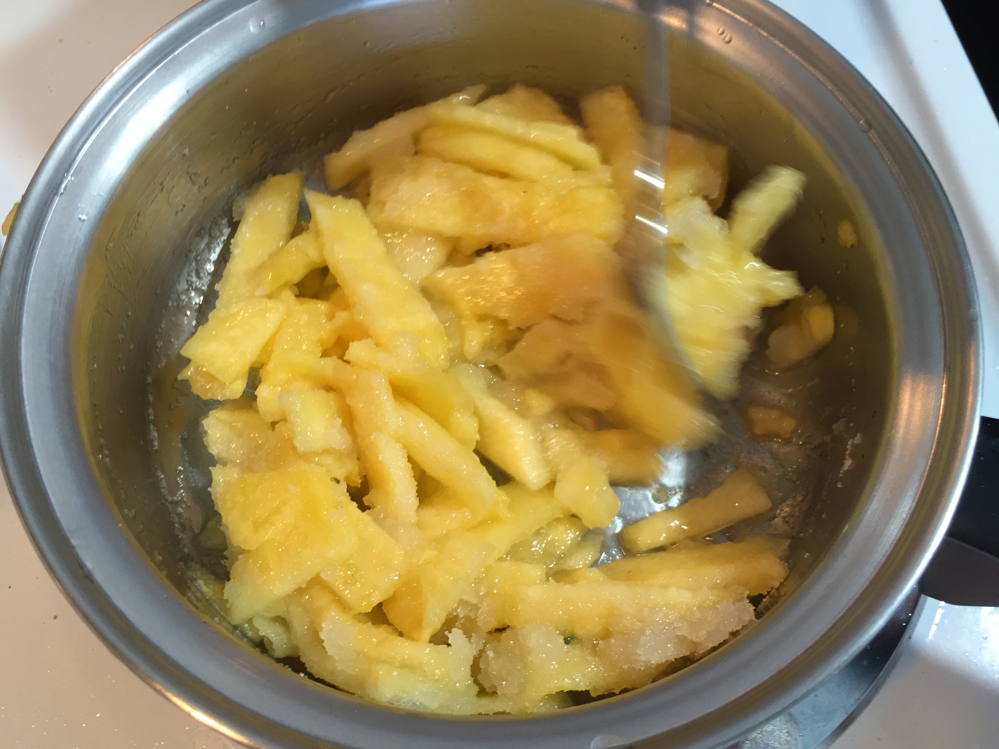 Combine the pineapple and ⅓ cup of sugar in a pot on high heat and stir for approximately 7 minutes or until the pineapple chunks have caramelized.