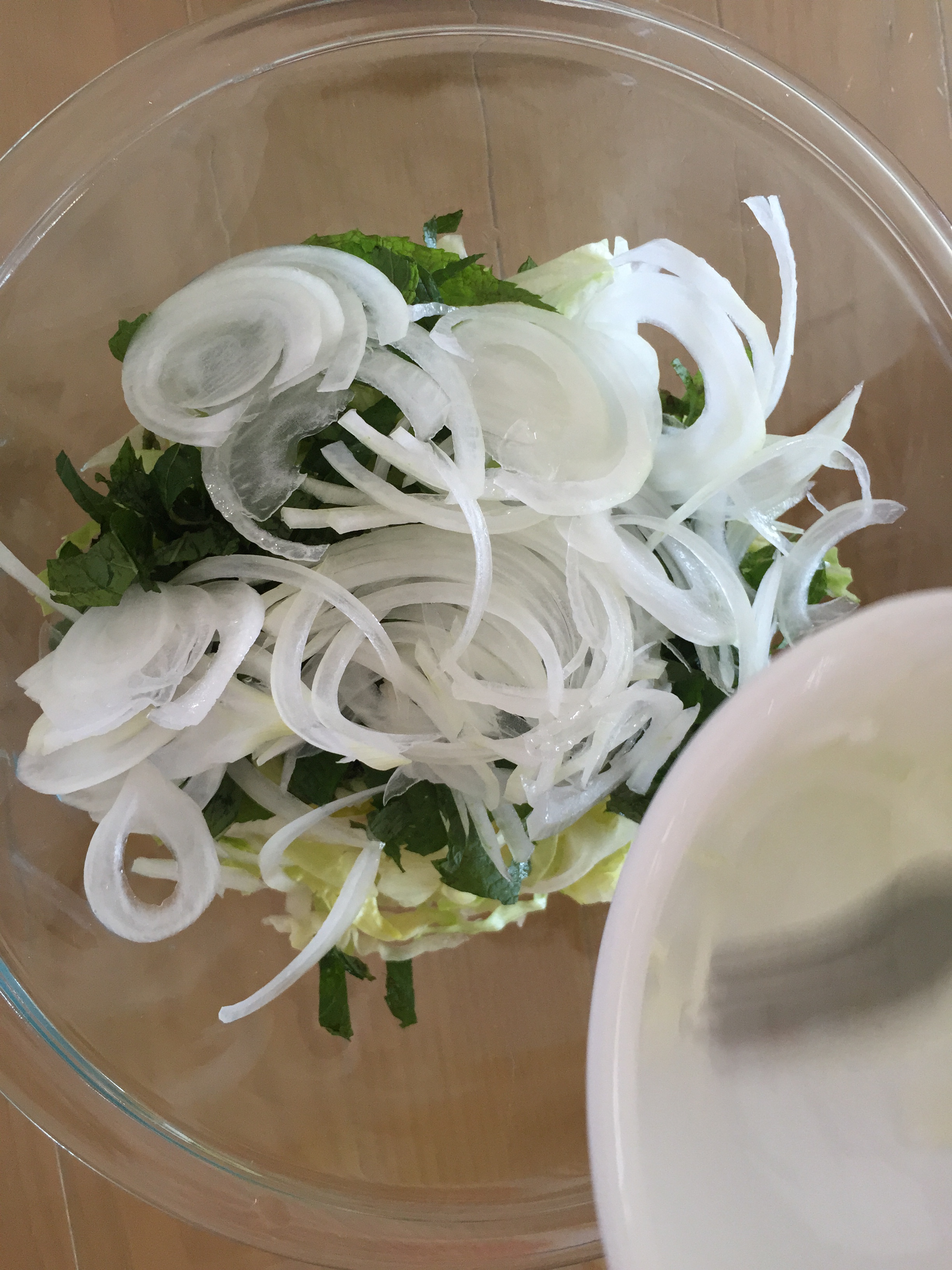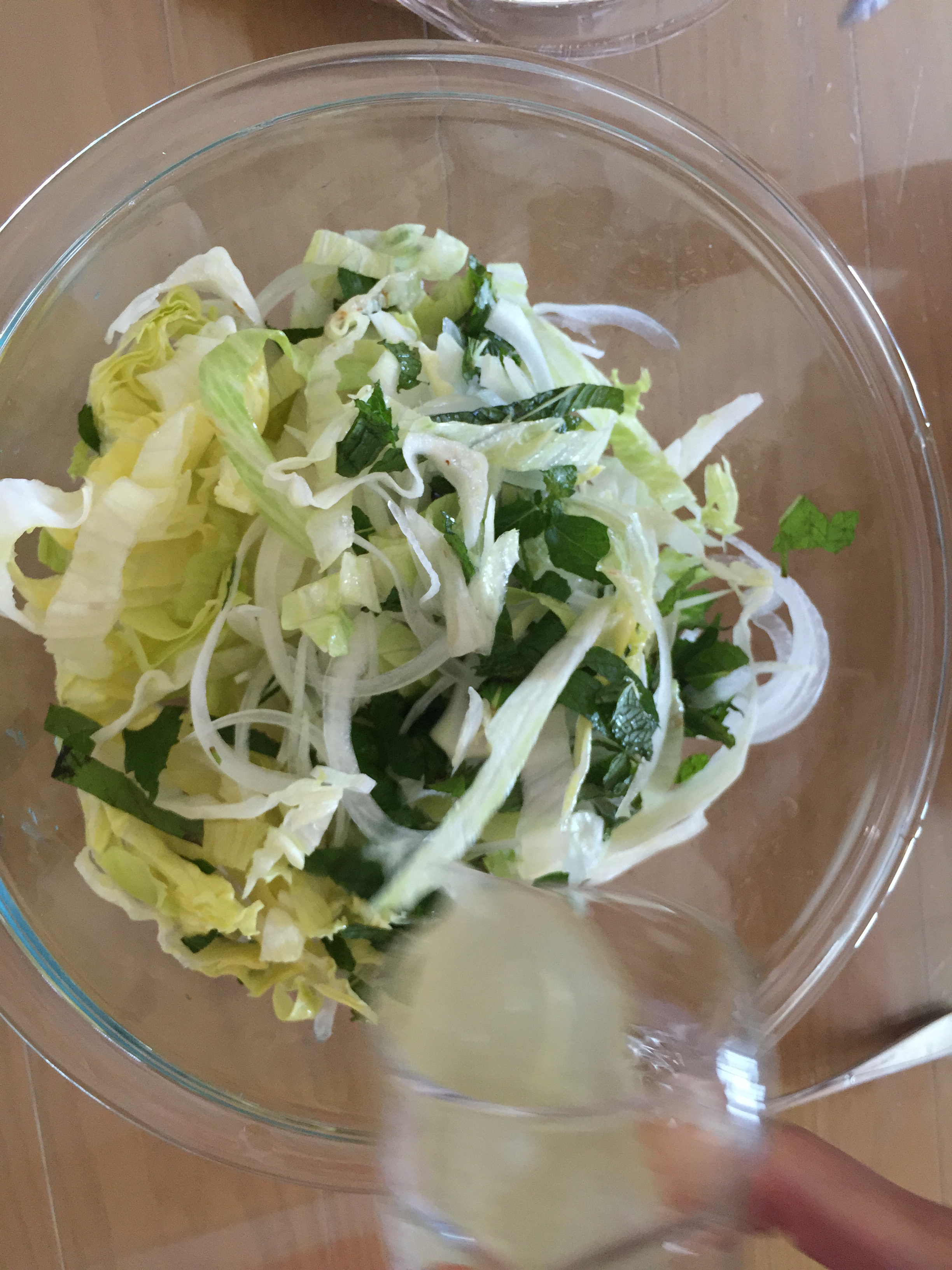 Strain the onion and add the lettuce and mint to a large bowl. Add the reserved lime sauce and mix well.