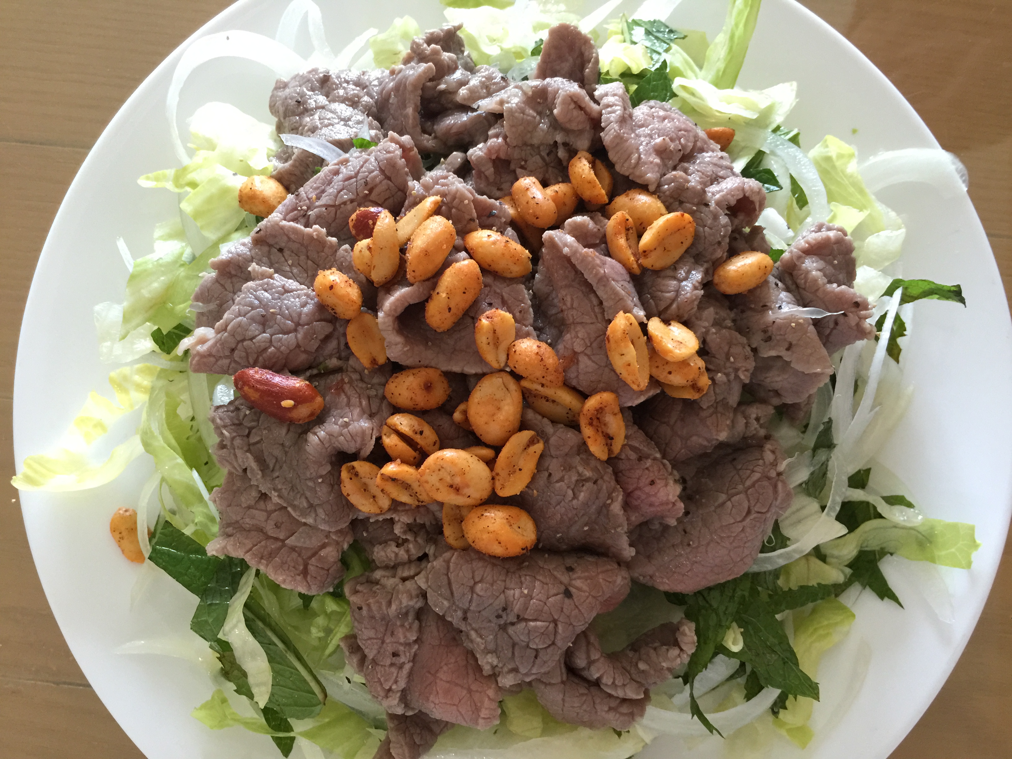 Plate the salad with the salad mix and top with the marinated beef. Add a pinch of ground pepper and a handful of toasted peanuts.