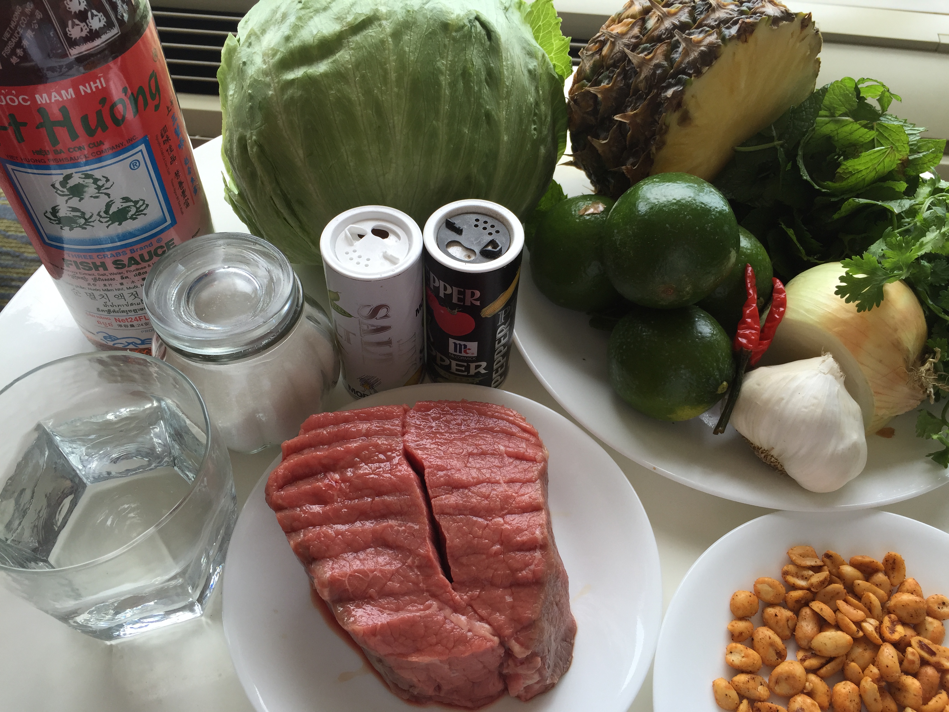 My family vacations in Virginia Beach every year around this time in August. The great thing about the family reunion is that I get to spend time with my relatives who are crazy good cooks. Aunt Qua is another amazing home cook and luckily for me, she agreed to spend time showing me some of her best and easy to make dishes. In this post we will make bò tái chanh. Bò tái chanh is a refreshing salad with beef cooked in lime juice. It is the Vietnamese version of beef carpacio. The pineapple and chili sauce is my family’s concoction to replace the typical pungent fish paste sauce. A little of the sauce over the fresh lime marinated beef and salad hits the spot, especially during the hot and steamy summer. I guarantee that this salad will be gone in no time.