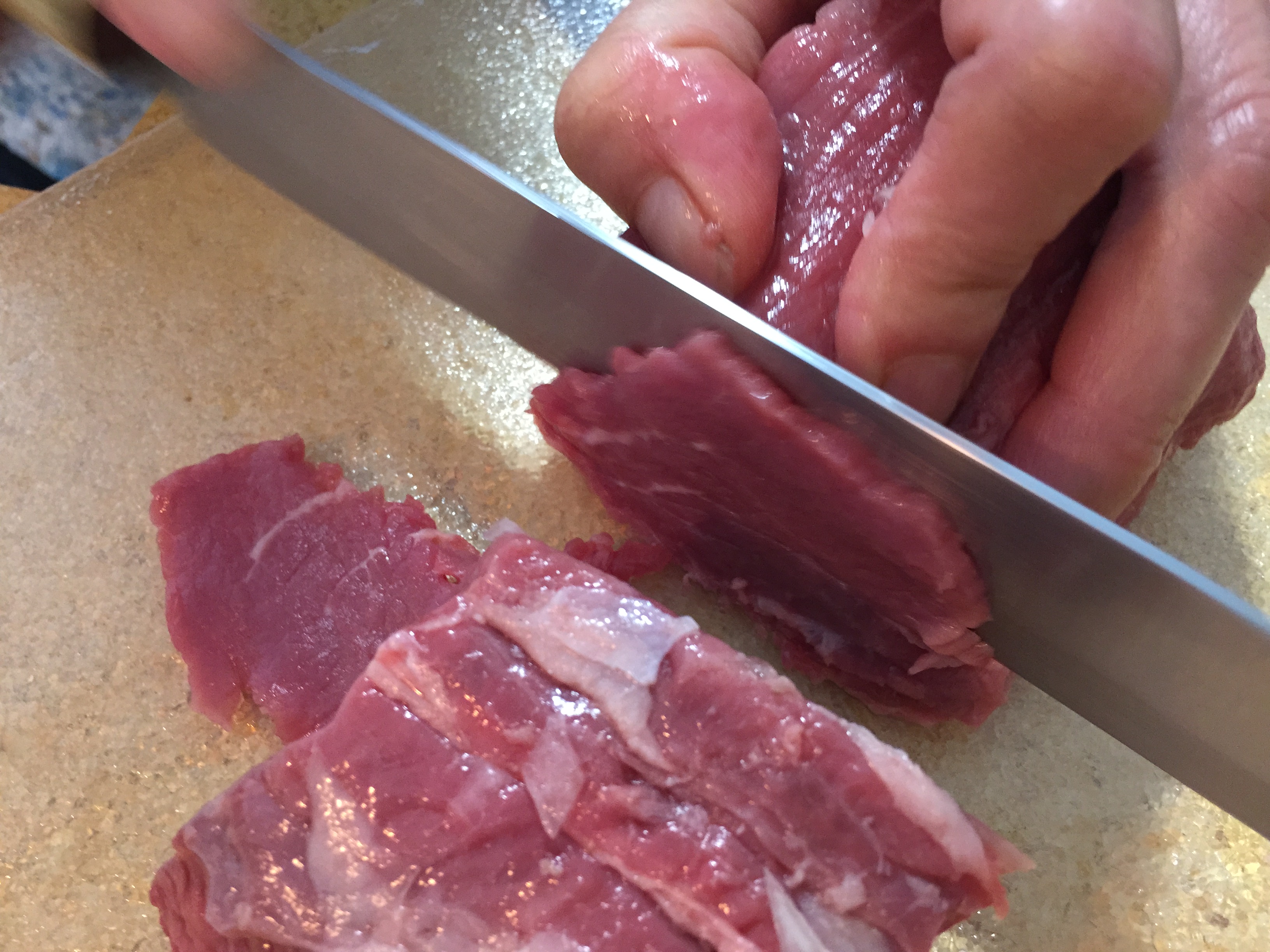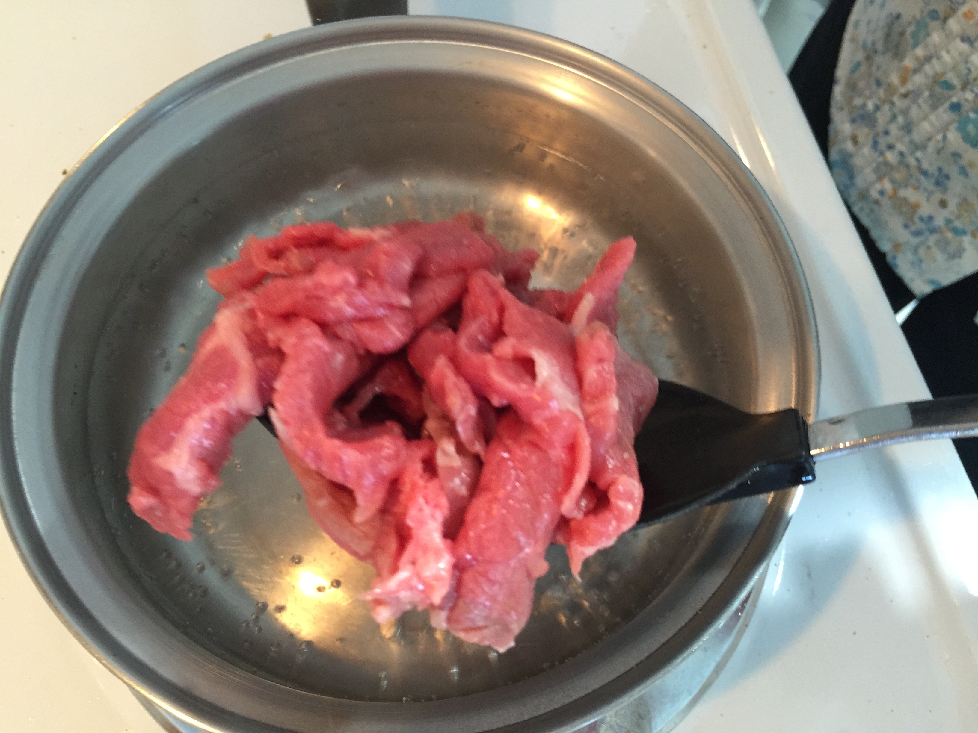 Boil 2 cups of water in a small pot. We will use this to blanch the beef.