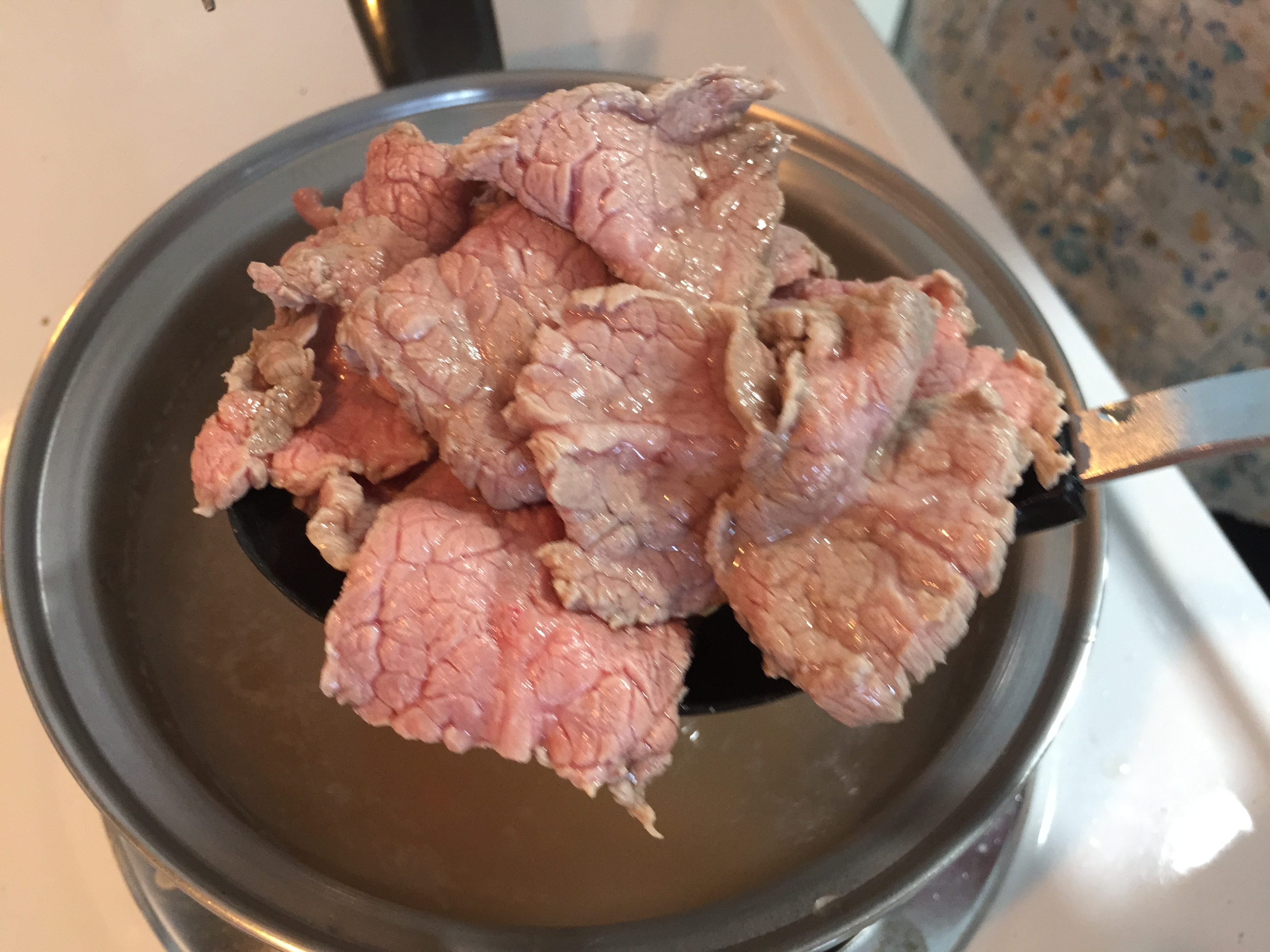 Once the water almost boils, blanch the beef in batches. Drop the beef into the water and remove them right away with a slotted spoon.