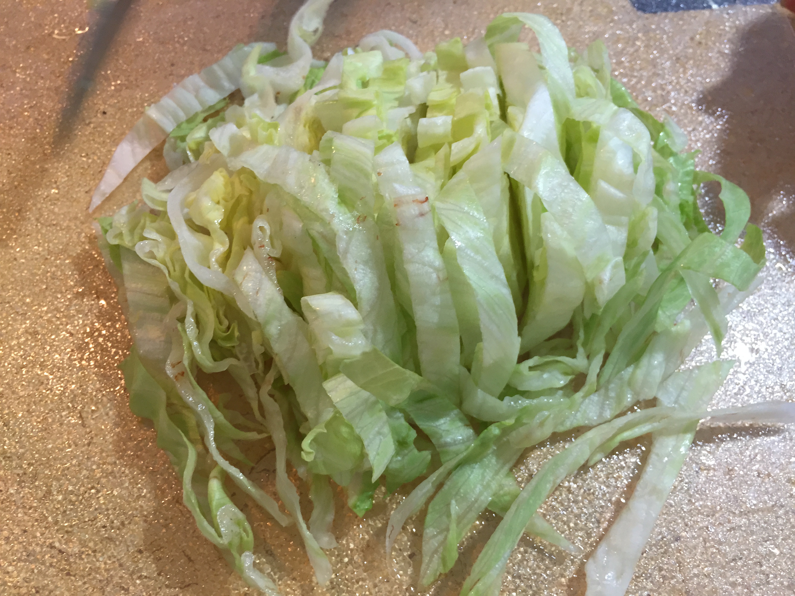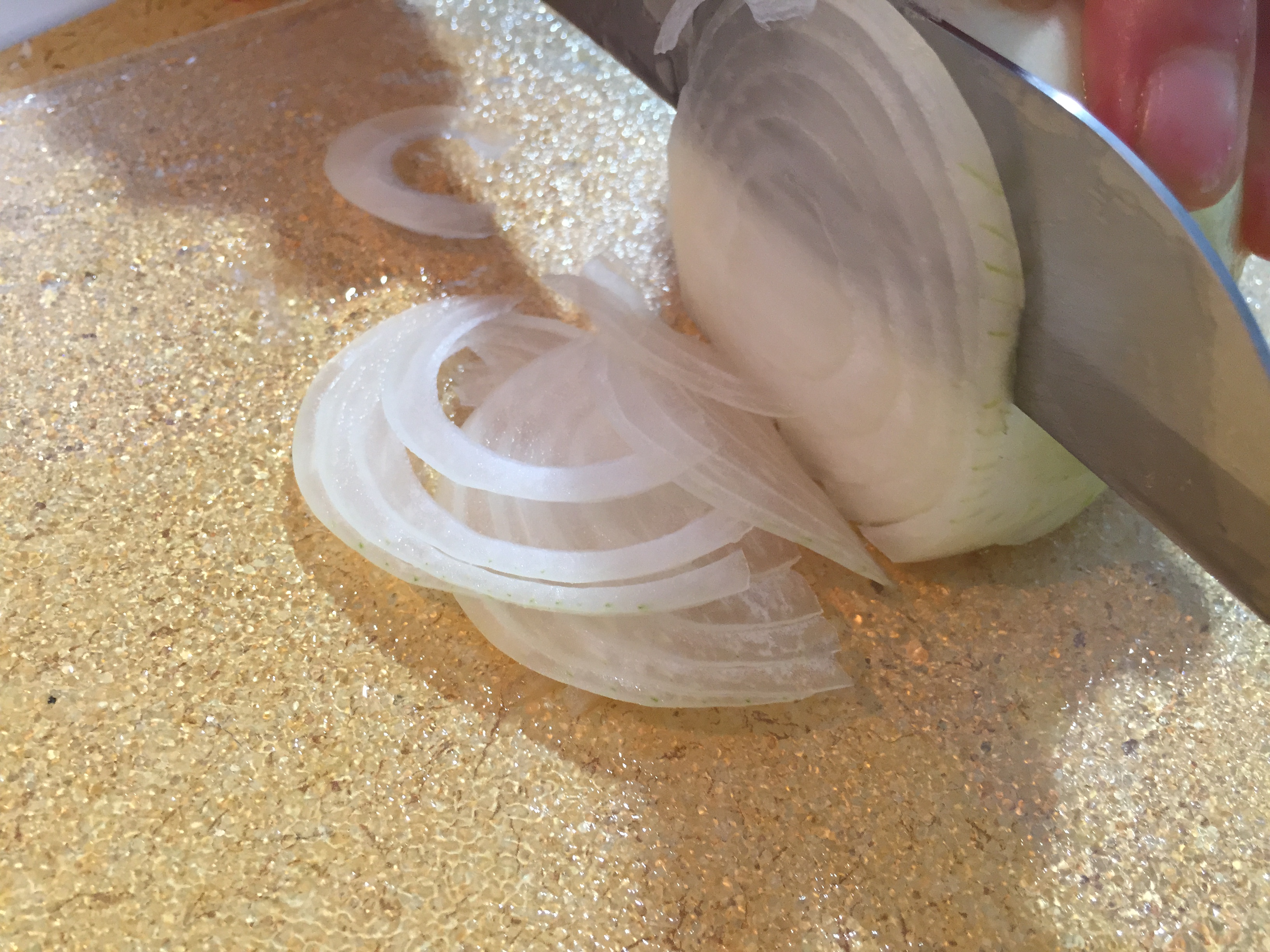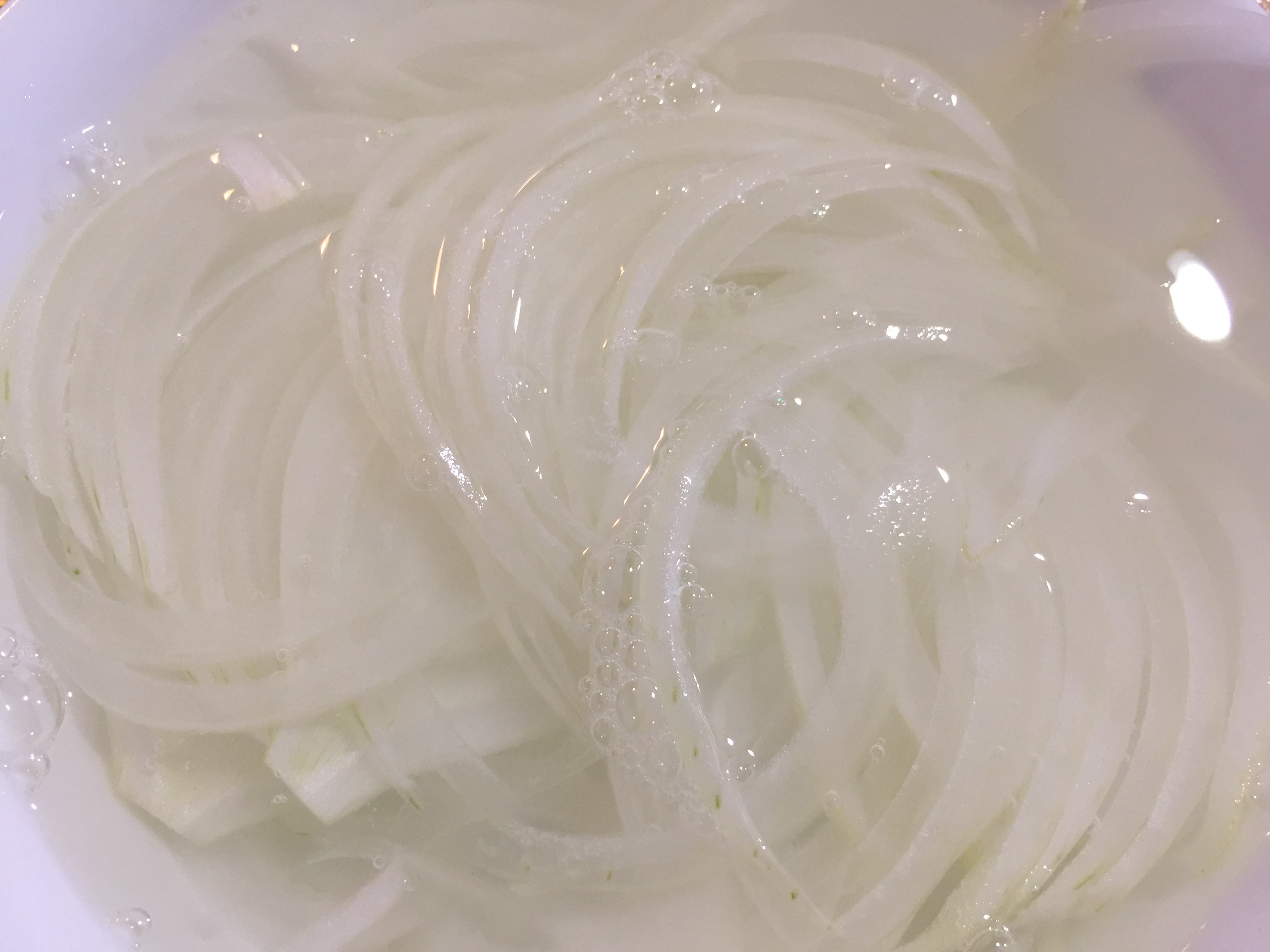 Thinly slice ½ of a medium yellow onion and place into a bowl of water for at least 10 minutes to remove the bite. If you like the sharp onion taste, only soak the onion for 5 minutes.