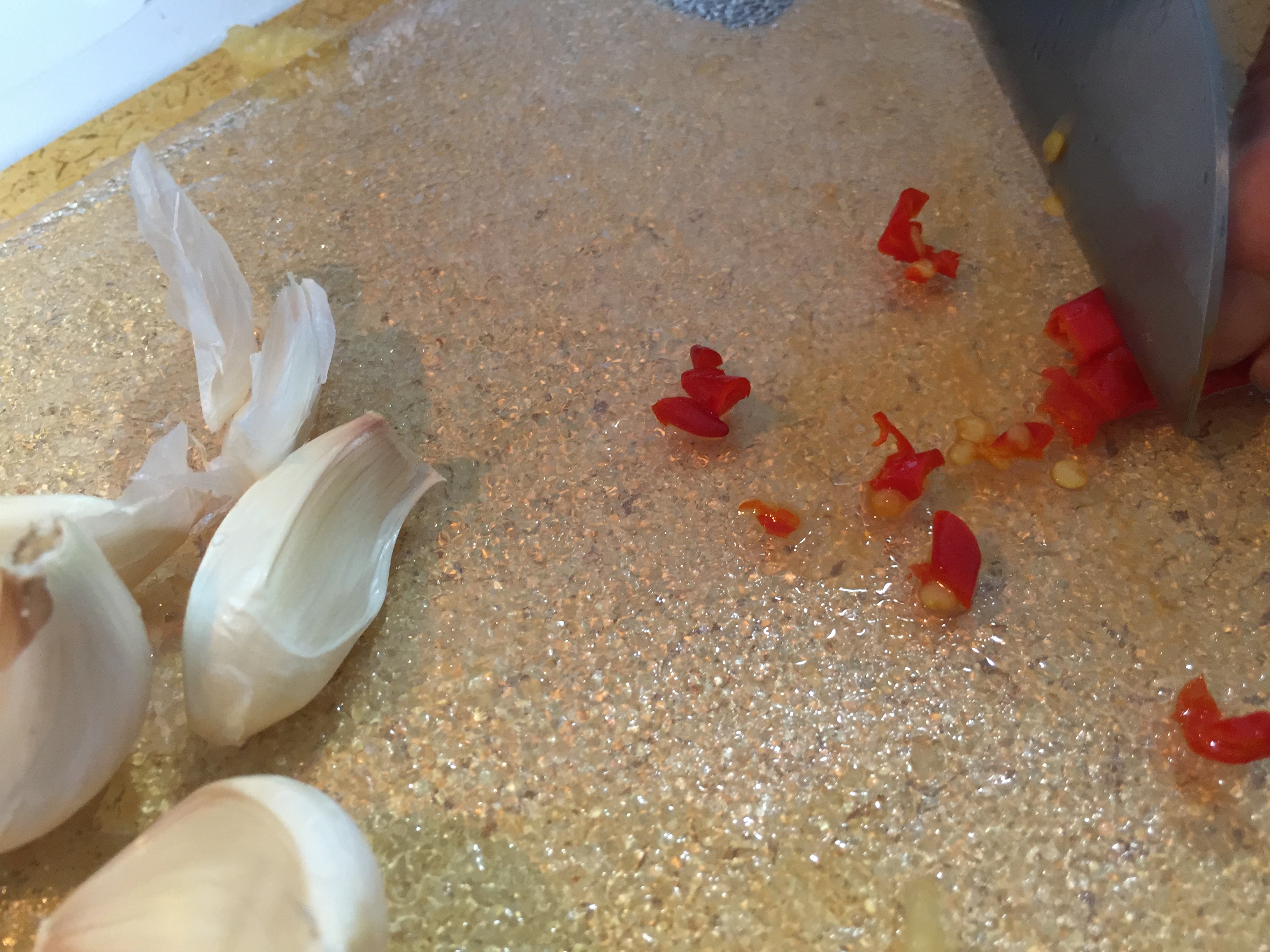 Mince 2 Thai chili and 3 cloves of garlic and set aside. You can remove the seeds from the chili to lower the level of spiciness or just add only 1 Thai chili. This will give another dimension to the sauce.