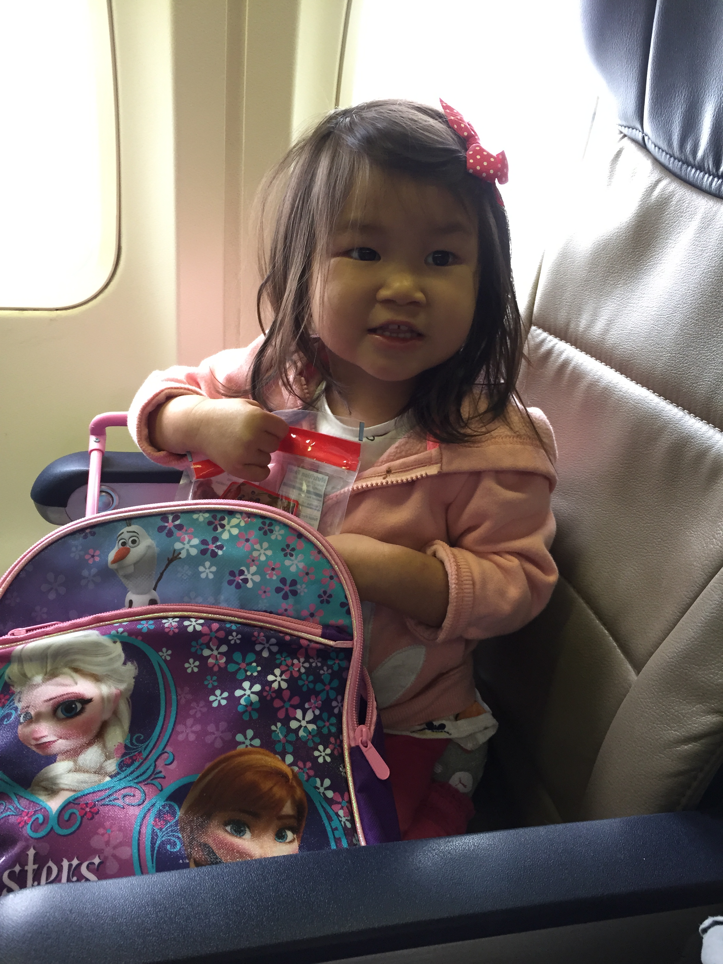 - Last but not least…crying. It’s inevitable. It happens. We’ve been there. Take advantage of the walkway to stand up with your child and take a walk (as long as the seatbelt sign is not on). Bring a baby carrier if he/she likes to be worn. Booking flights around the child’s non-fussy or naptimes help. Bring entertainment and snacks or slip in some Benadryl (I kid, I kid about the Benadryl! BUT, true confession, we’ve done this, but to our credit, she had allergies.)