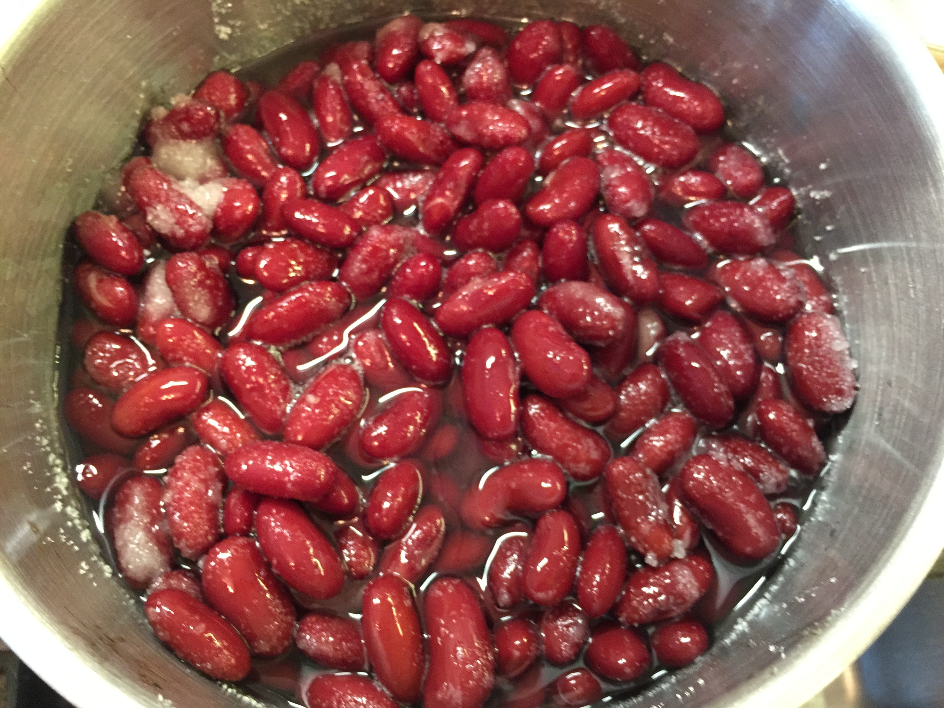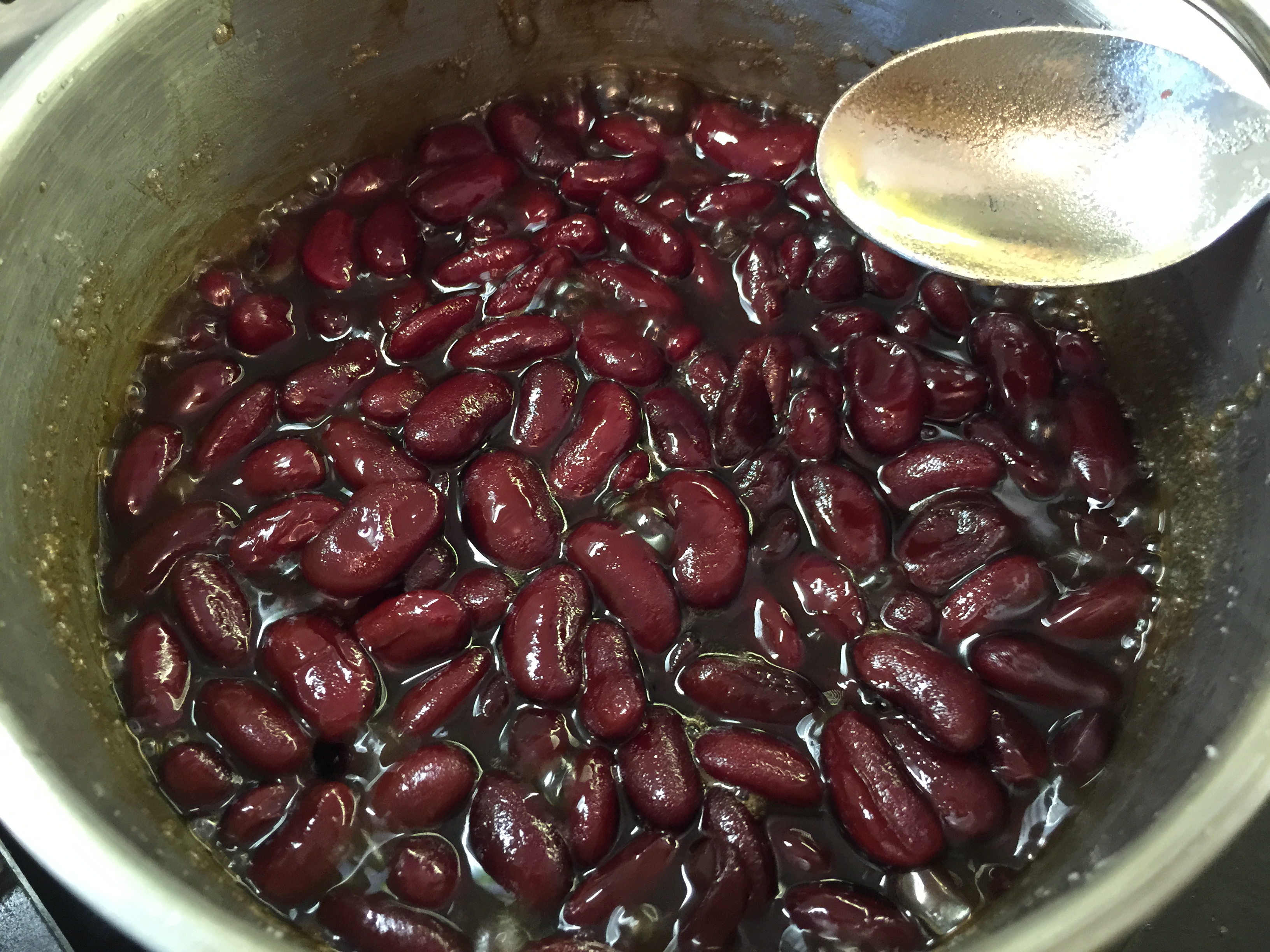 Add the dark kidney beans, ½ cup of water, and 1 cup of sugar to a pot and cook on medium heat. Stir occasionally and skim away any foam. The goal is to have the beans absorb all the water.