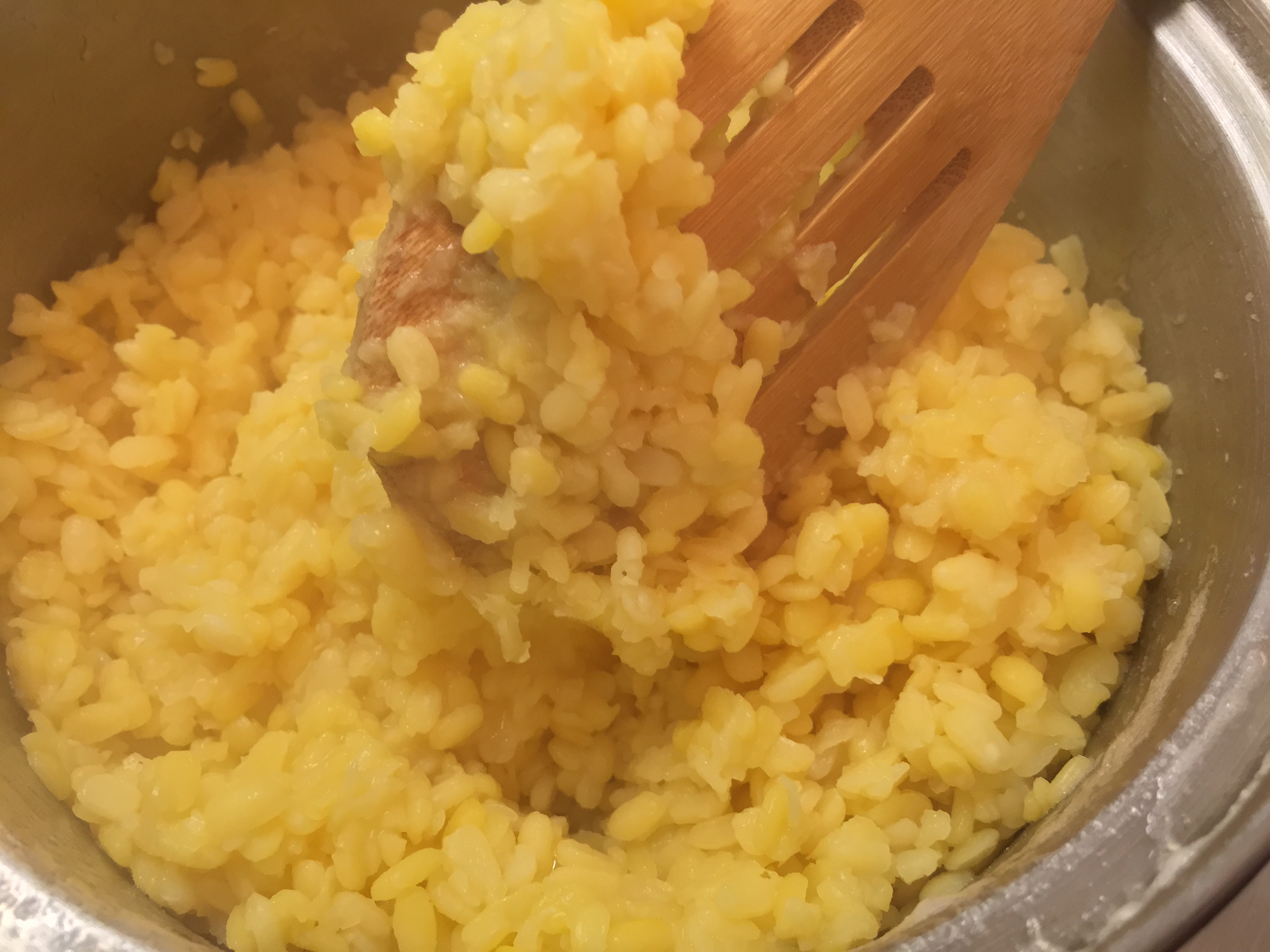 When the mung bean is cooked (total cooking time approx. 20-25 minutes), stir in 1 cup of sugar and ⅛ teaspoon of vanilla extract. When you are stirring, press the mung bean down with the back of the spoon so that the mung bean is mashed and has a paste-like consistently. Turn the heat off.