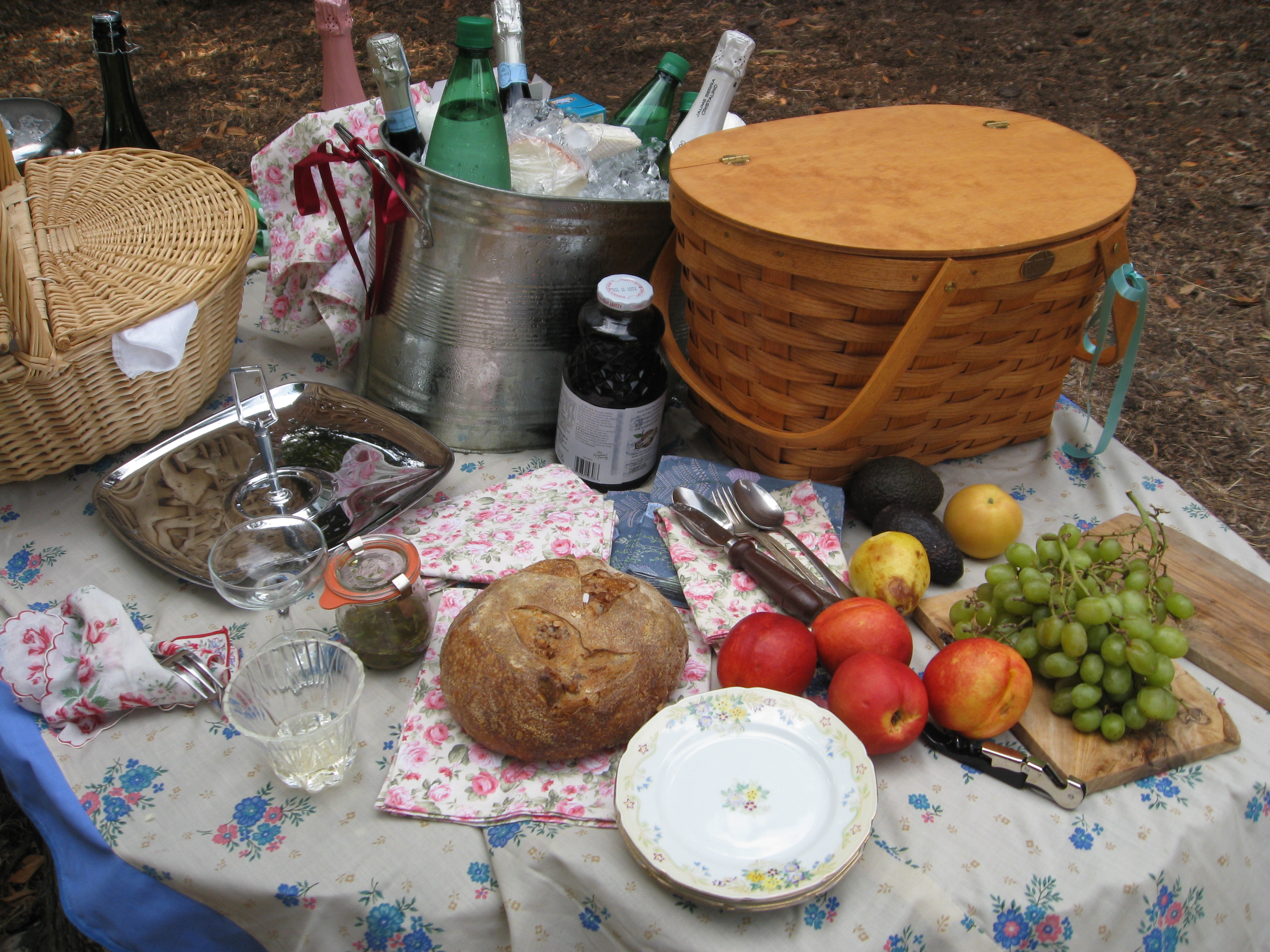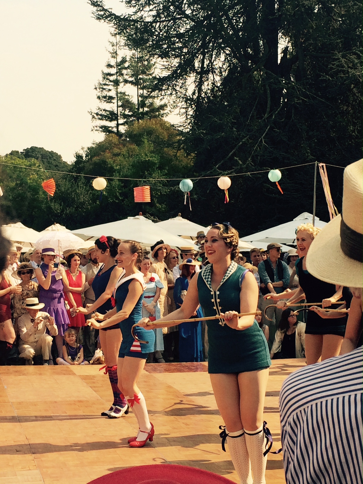 I arrived early before the gates opened to grab one of the front spots in line at the entrance. Wearing a printed vintage style dress, I dressed it up with white gloves, ribbon, and a bonnet. I carried a basket full of food that would contribute to my group’s spread of dishes for our picnic. At 1 pm, horse-drawn carriages and vintage car shuttles transported us across the grounds of the Dunsmuir Mellman Historic Estate. Outdoor rented tables, umbrellas, and chairs were set up in front of the mansion as well as a a fine display of vintage cars. Groups were starting to claim their spots on the grass, and my own group found a nice shady spot by a pair of trees. It was time to set up our spread.