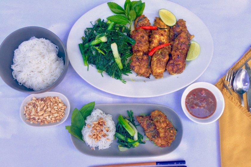 Fish with turmeric and dill or chả cá thì là is a famous Vietnamese dish made popular in the northern region of Vietnam. This dish typically has a hardy white fish marinated in turmeric and other seasonings and then pan fried with a lot of dill. My mom and I came up with a version that you can make at home. It has a few exotic ingredients that are generally available at an Asian grocer. This dish is fragrant and is served on a bed of vermicelli rice noodles and top with dill, peanuts and a dab of the aromatic sauce.
