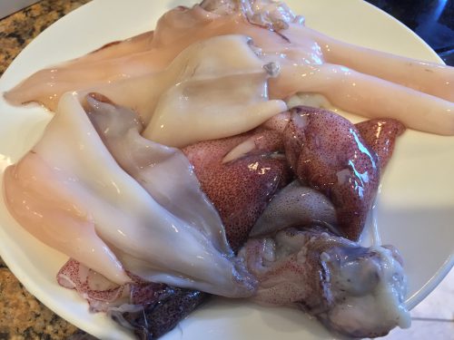 The squid before cleaning (the purple one) and after cleaning (white one)