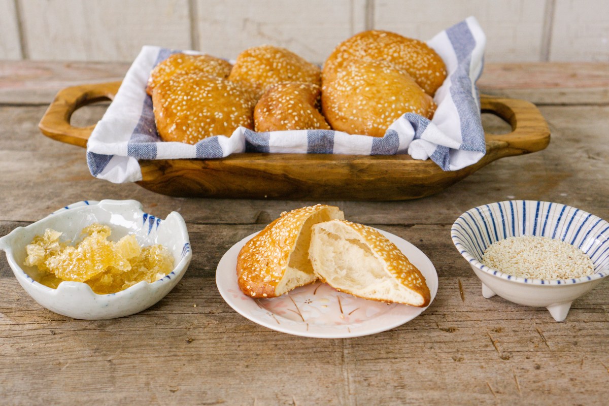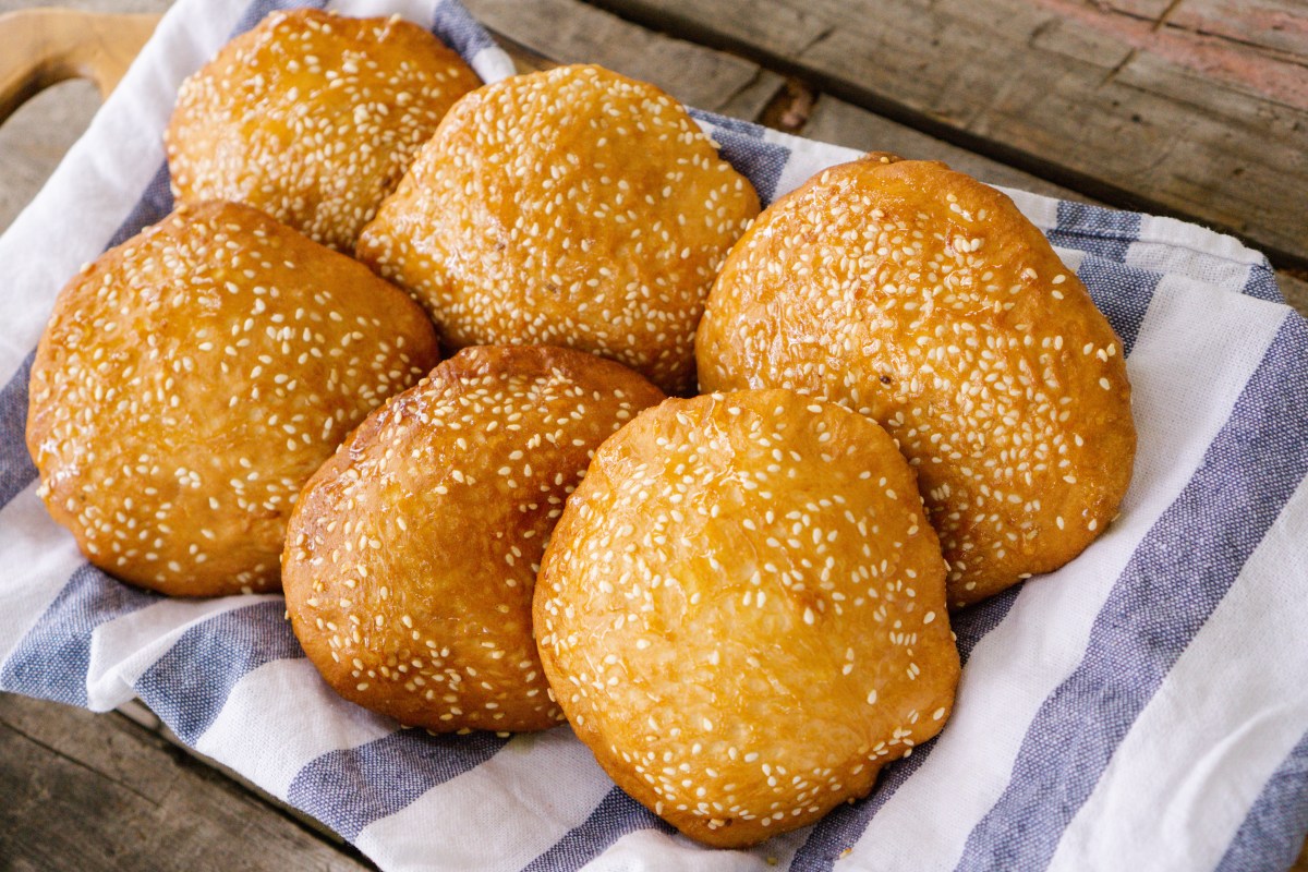 Divide the dough equally into 12 pieces. Form each piece into a ball and roll in sesame seeds. Let it rest covered for 20 minutes.