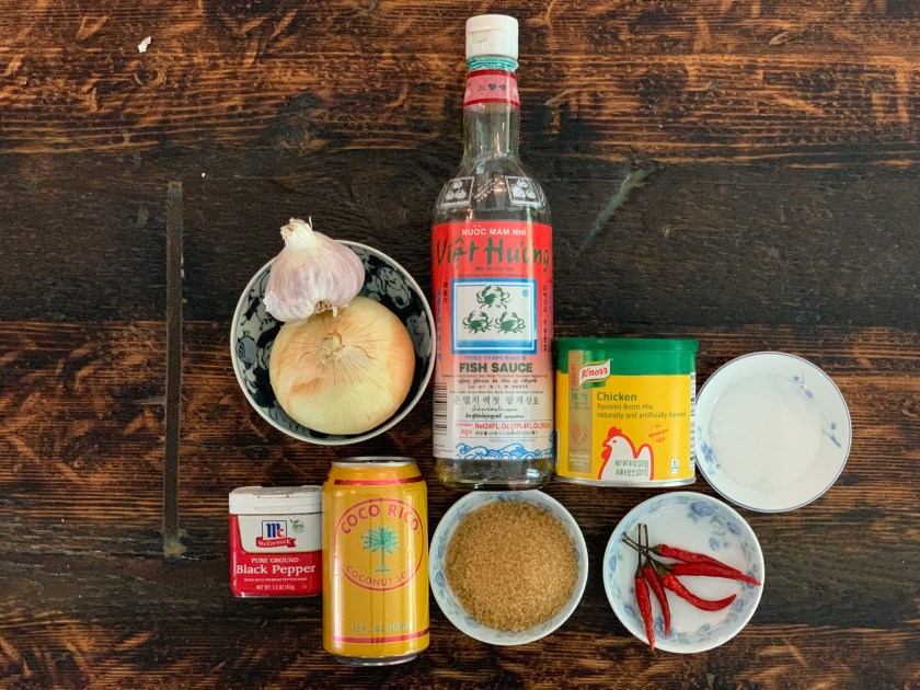 While the chicken marinates, make the braising sauce by combining 2 teaspoons of fish sauce, 2 teaspoons of cane sugar, 1 tablespoon of water, and 3 tablespoons of coconut soda in a small bowl and set aside.