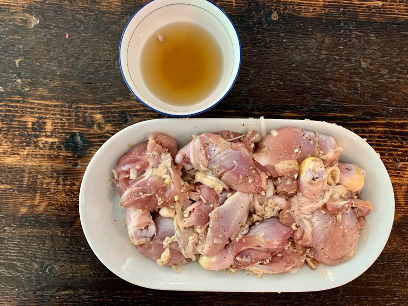 Marinate chicken with 1/4 teaspoon of salt, 1/2 teaspoons of chicken bouillon powder, 1 tablespoon of minced garlic, 1 tablespoon of diced onion, 1/2 teaspoon of ground black pepper and 1/2 teaspoon of sugar for 10 minutes.