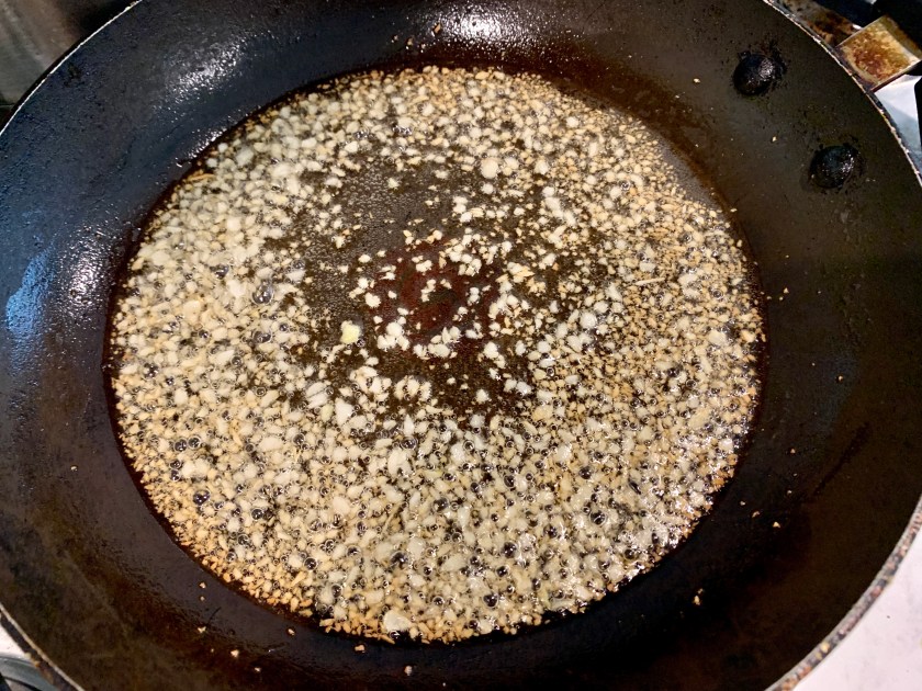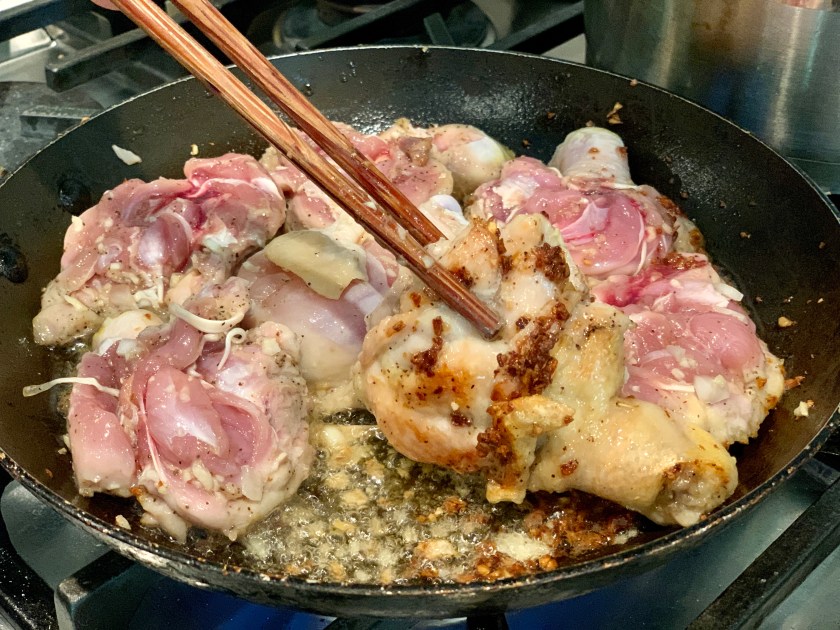 Heat a large pan with 2 tablespoons of oil on medium-high heat. Fry 1 tablespoon of minced garlic. Once the garlic turns golden brown, sear the drumsticks with skin side down. Flip the chicken over when they turn golden to sear the other side.