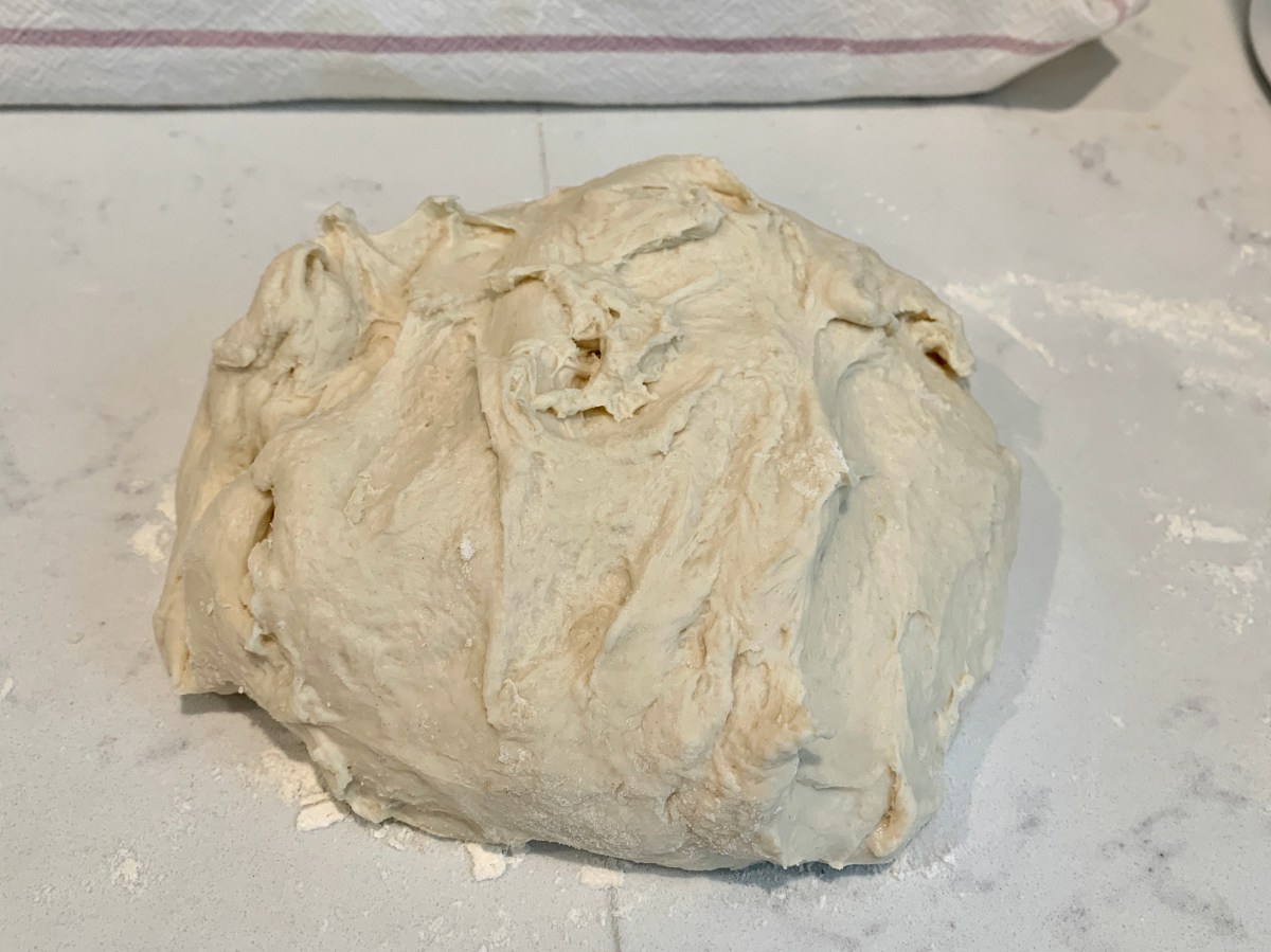 Flour your work surface and sprinkle flour on the top of the dough. Flip the bowl over and let gravity dump the wet dough (smooth side down) onto your work surface. Lightly sprinkle the top of the dough with more flour.