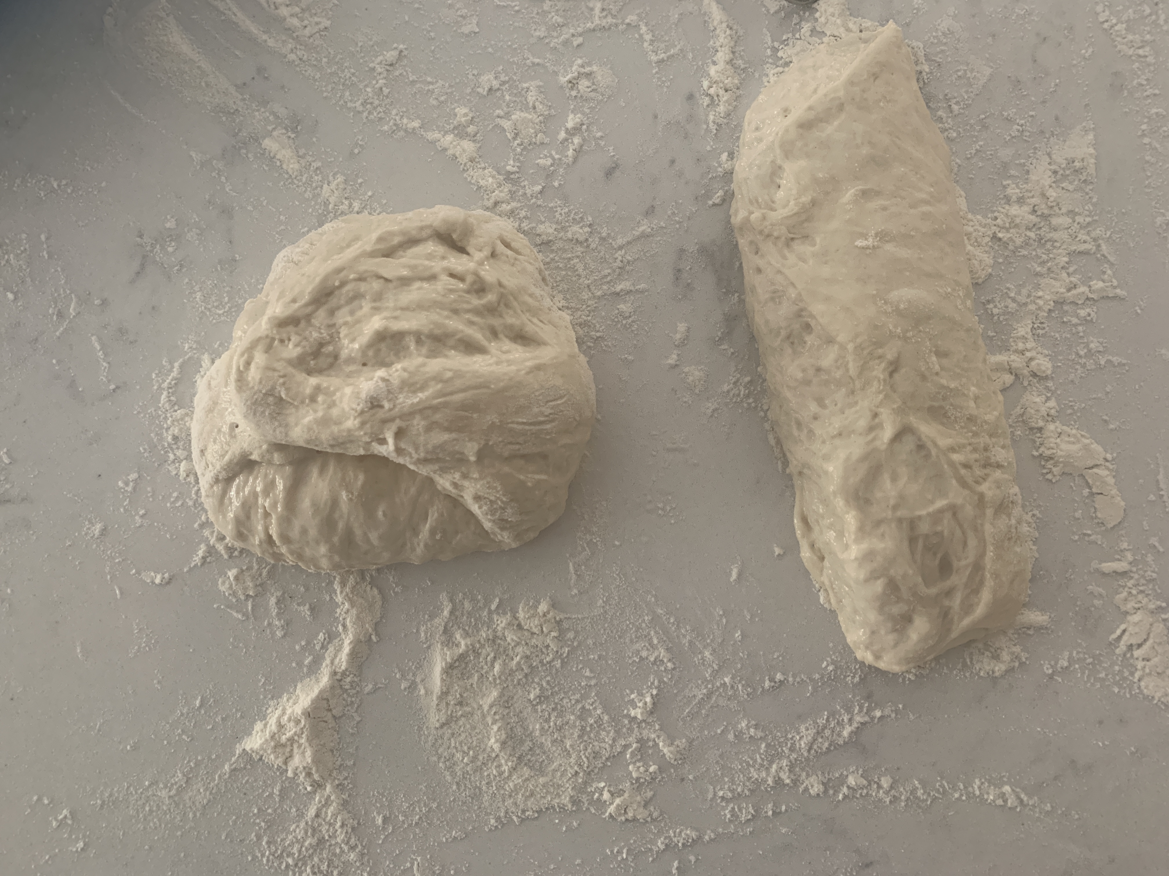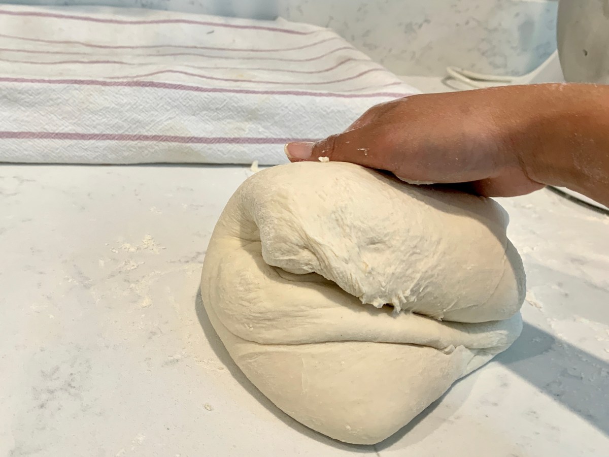 Pull up, lightly stretch, and fold each side of the dough inward to form a ball. Do this twice.
