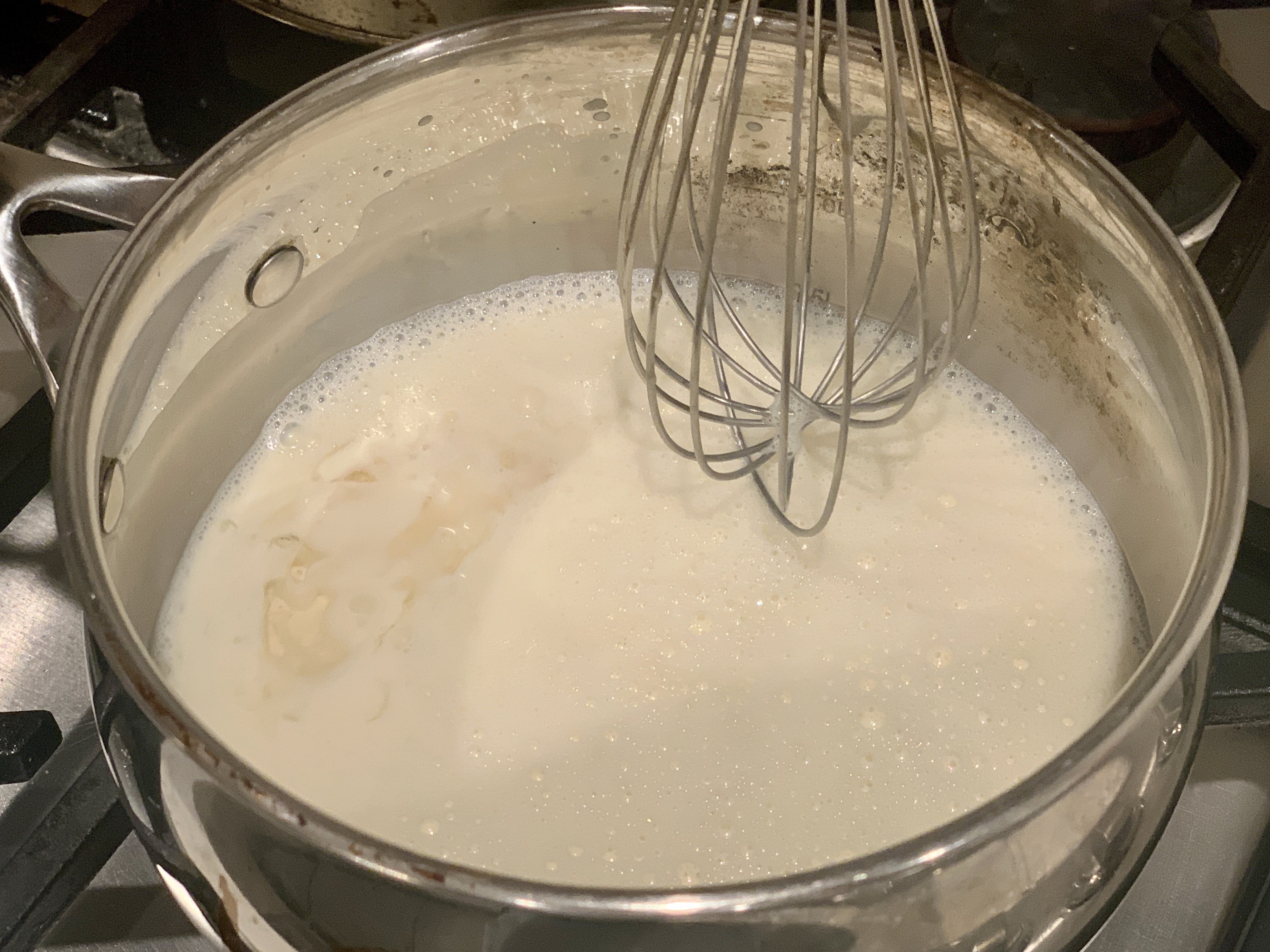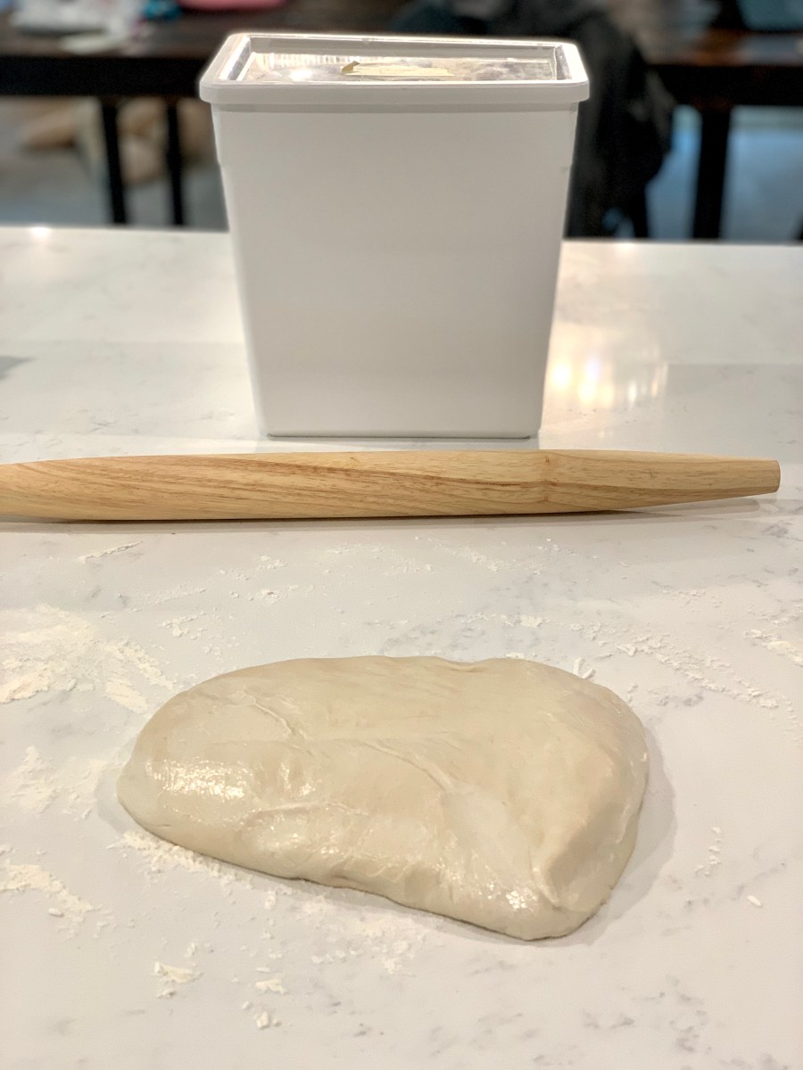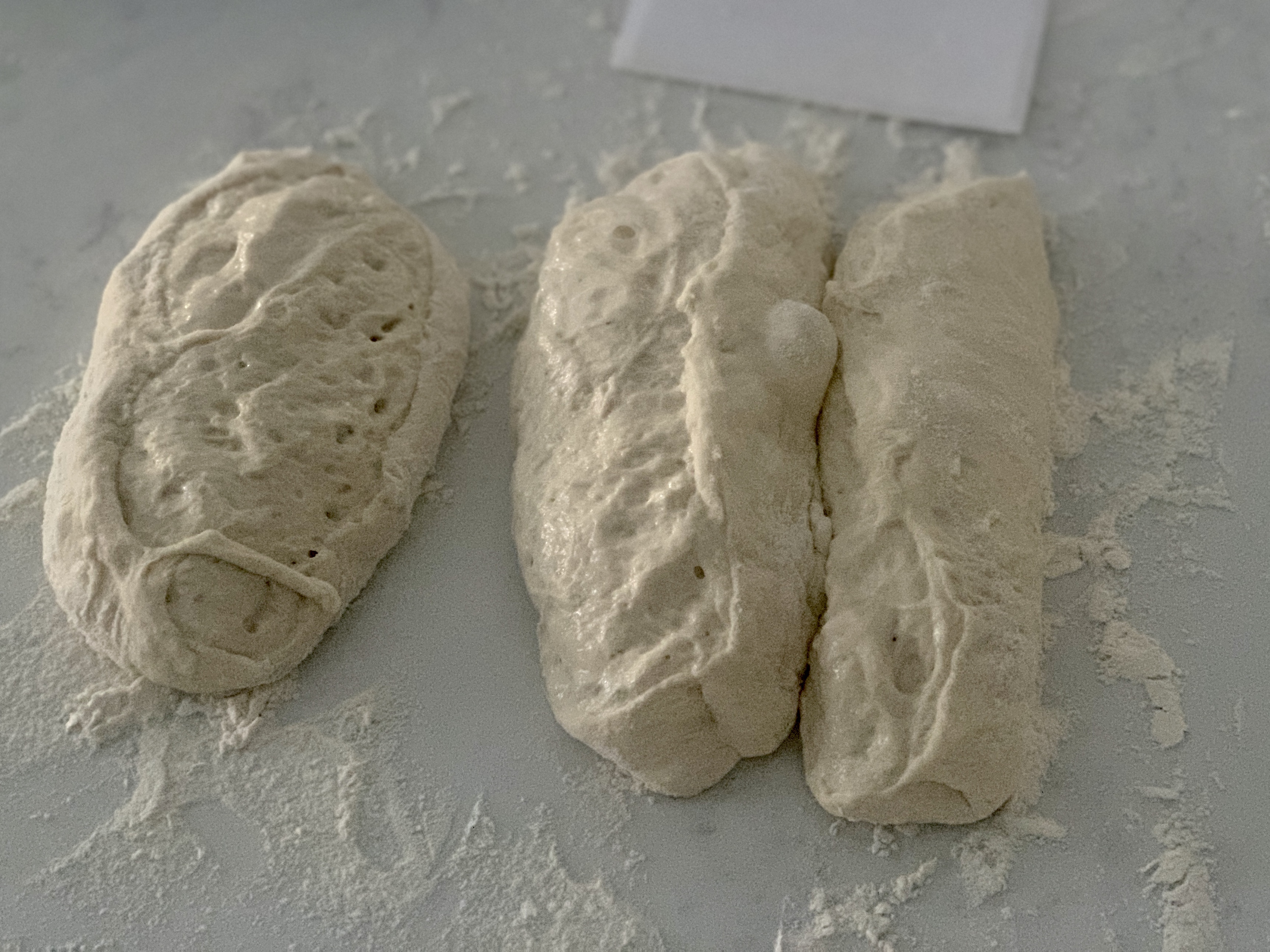 * You will see that the bread has grown in size and doesn’t appear to have as much structure as a traditional baguette to hold itself up. That is why having a “couche” helps keep the baguette shape and using the parchment paper underneath will make it easier to maneuver the wet dough into the oven.