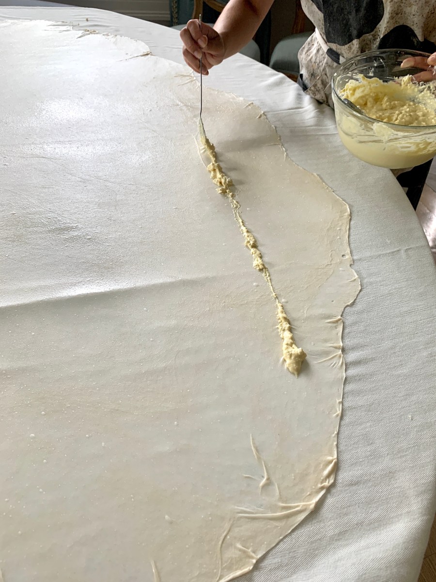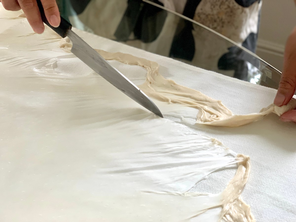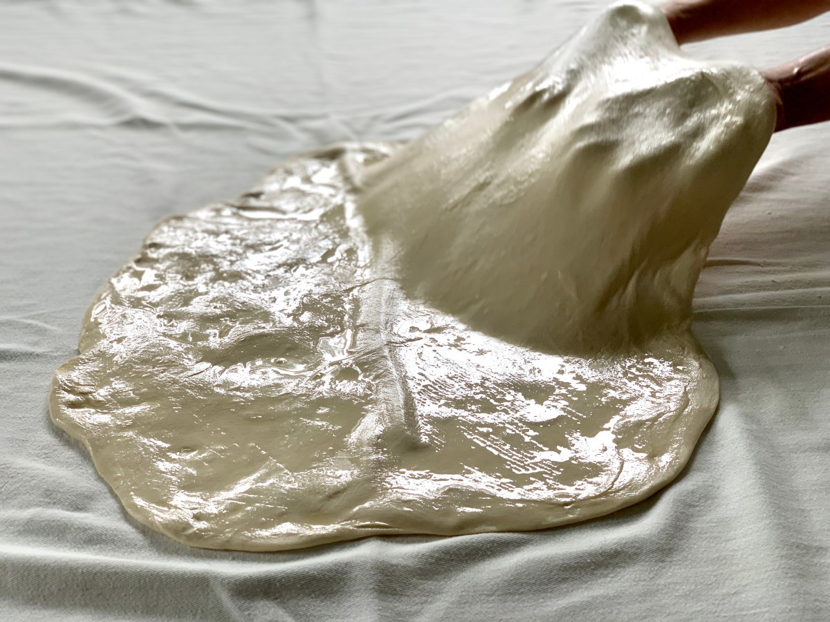 Next, keep stretching the dough by rolling lightly as you move your hands outward to create the desired shape. You are looking for the dough to have a long straight line with tapered edges.